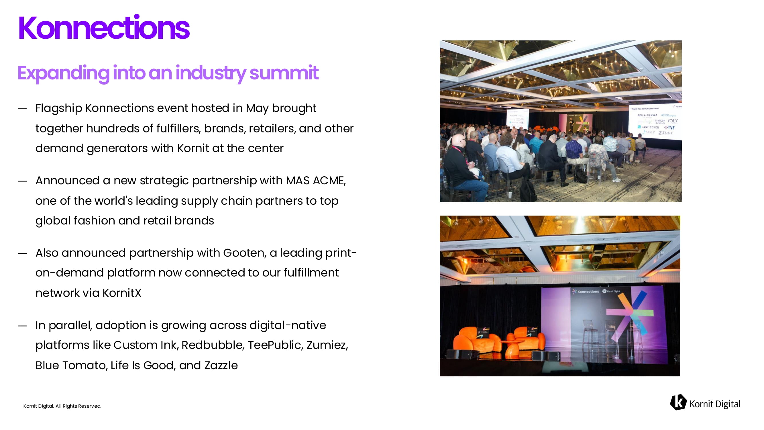 Kornit Digital. All Rights Reserved. ― Flagship Konnections event hosted in May brought together hundreds of fulfillers, brands, retailers, and other demand generators with Kornit at the center ― Announced a new strategic partnership with MAS ACME, one of the world's leading supply chain partners to top global fashion and retail brands ― Also announced partnership with Gooten , a leading print - on - demand platform now connected to our fulfillment network via KornitX ― In parallel, adoption is growing across digital - native platforms like Custom Ink, Redbubble, TeePublic , Zumiez, Blue Tomato, Life Is Good, and Zazzle Konnections