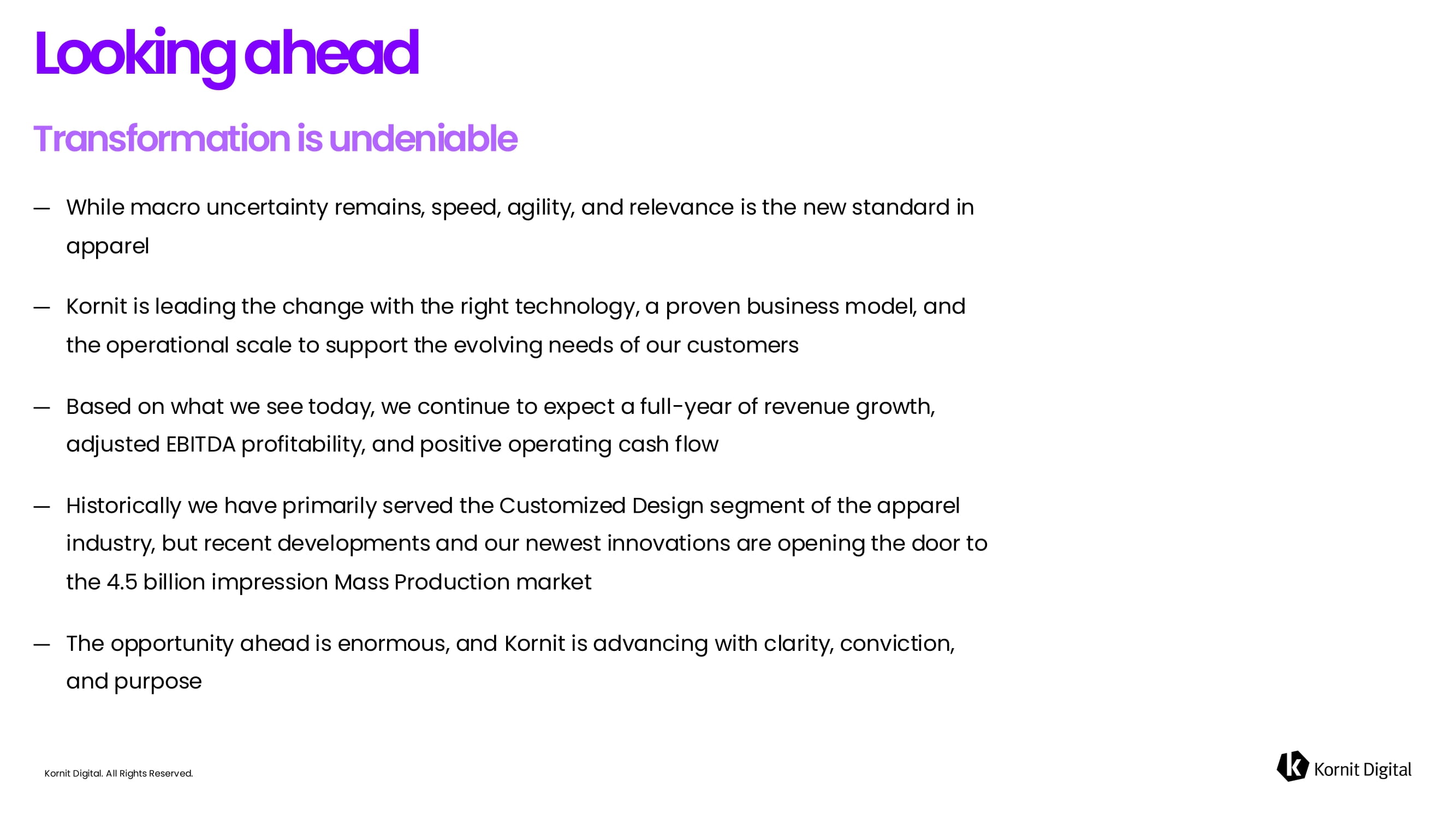 Kornit Digital. All Rights Reserved. ― While macro uncertainty remains, speed, agility, and relevance is the new standard in apparel ― Kornit is leading the change with the right technology, a proven business model, and the operational scale to support the evolving needs of our customers ― Based on what we see today, we continue to expect a full - year of revenue growth, adjusted EBITDA profitability, and positive operating cash flow ― Historically we have primarily served the Customized Design segment of the apparel industry, but recent developments and our newest innovations are opening the door to the 4.5 billion impression Mass Production market ― The opportunity ahead is enormous, and Kornit is advancing with clarity, conviction, and purpose Looking ahead