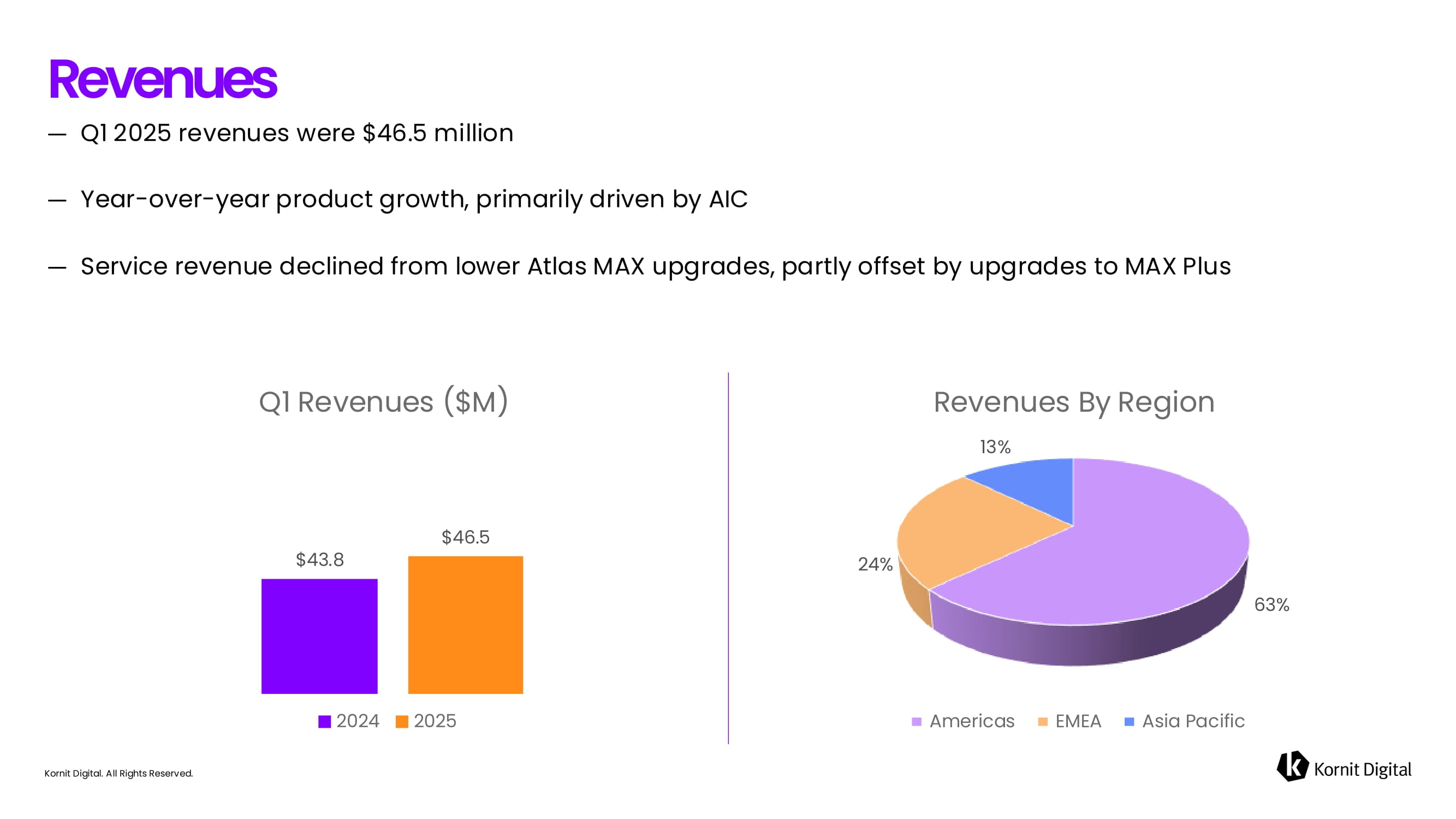 Kornit Digital. All Rights Reserved. ― Q 1 2025 revenues were $ 46.5 million ― Year - over - year product growth, primarily driven by AIC ― Service revenue declined from lower Atlas MAX upgrades, partly offset by upgrades to MAX Plus Revenues $43.8 $46.5 Q1 Revenues ($M) 2024 2025 63% 24% 13% Revenues By Region Americas EMEA Asia Pacific