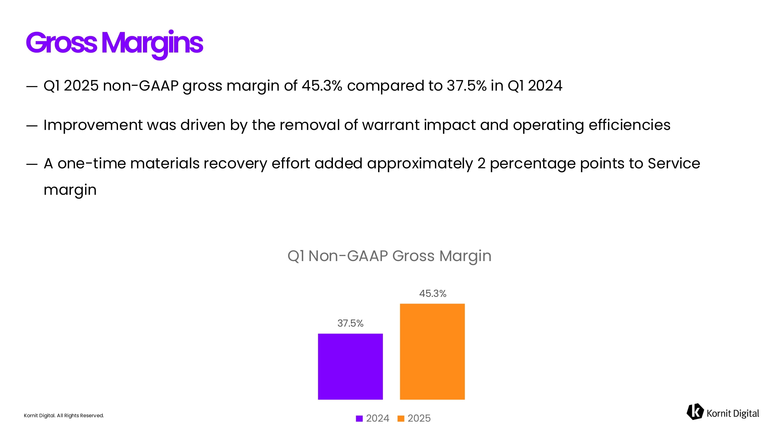 Kornit Digital. All Rights Reserved. ― Q1 2025 non - GAAP gross margin of 45.3% compared to 37.5% in Q1 2024 ― Improvement was driven by the removal of warrant impact and operating efficiencies ― A one - time materials recovery effort added approximately 2 percentage points to Service margin Gross Margins 37.5% 45.3% Q1 Non - GAAP Gross Margin 2024 2025