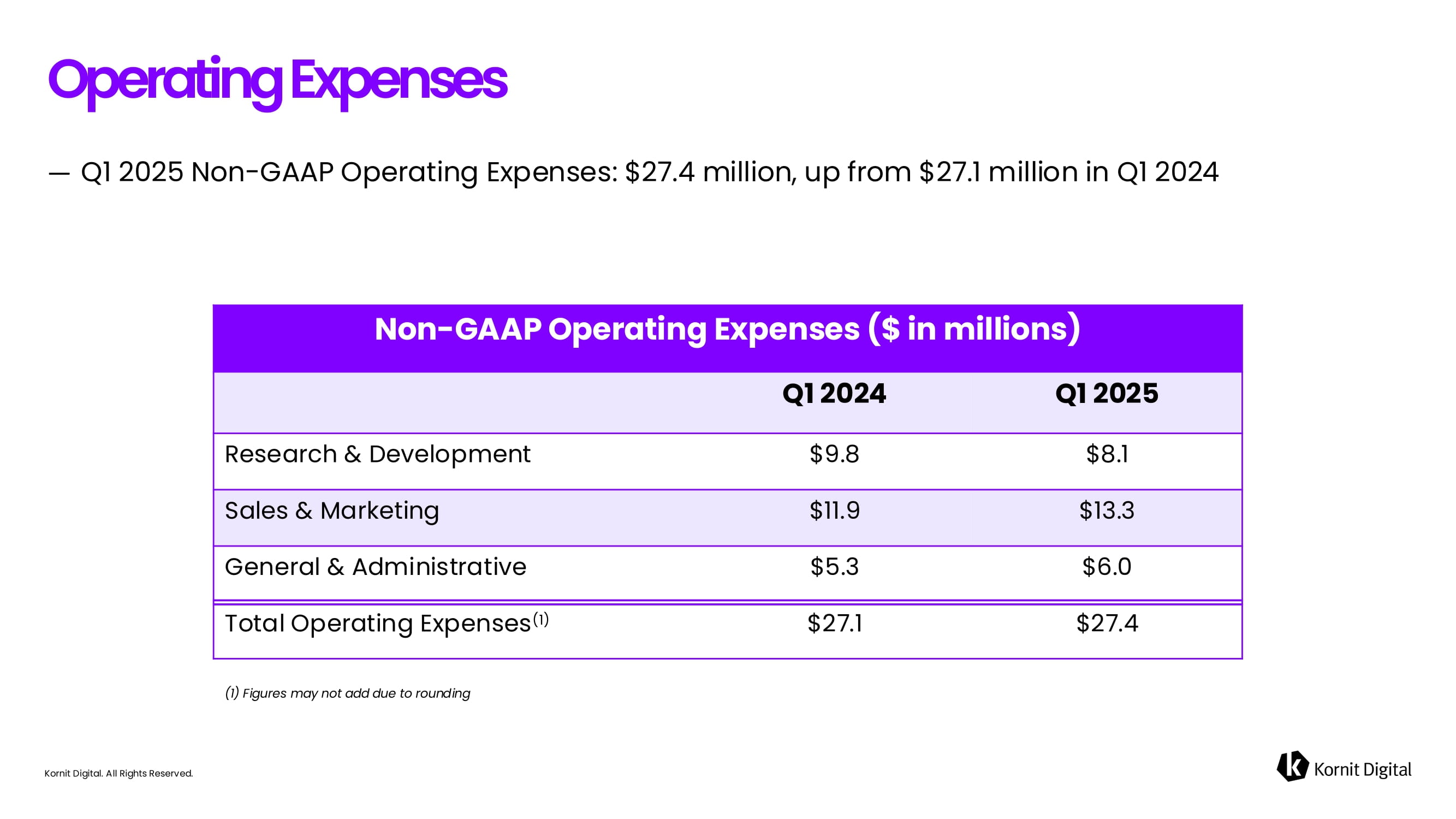 Kornit Digital. All Rights Reserved. ― Q1 2025 Non - GAAP Operating Expenses: $27.4 million, up from $27.1 million in Q1 2024 Operating Expenses Non - GAAP Operating Expenses ($ in millions) Q1 2025 Q1 2024 $8.1 $9.8 Research & Development $13.3 $11.9 Sales & Marketing $6.0 $5.3 General & Administrative $27.4 $27.1 Total Operating Expenses (1) ( 1 ) Figures may not add due to rounding
