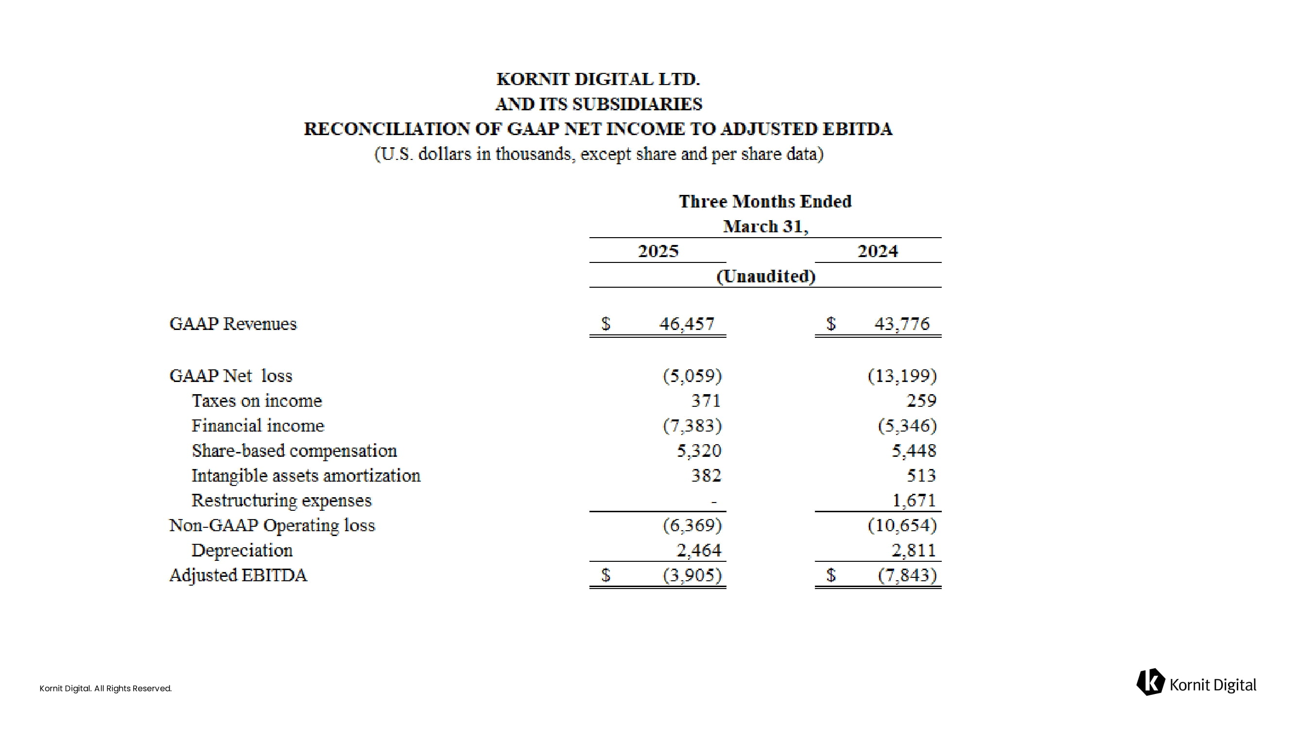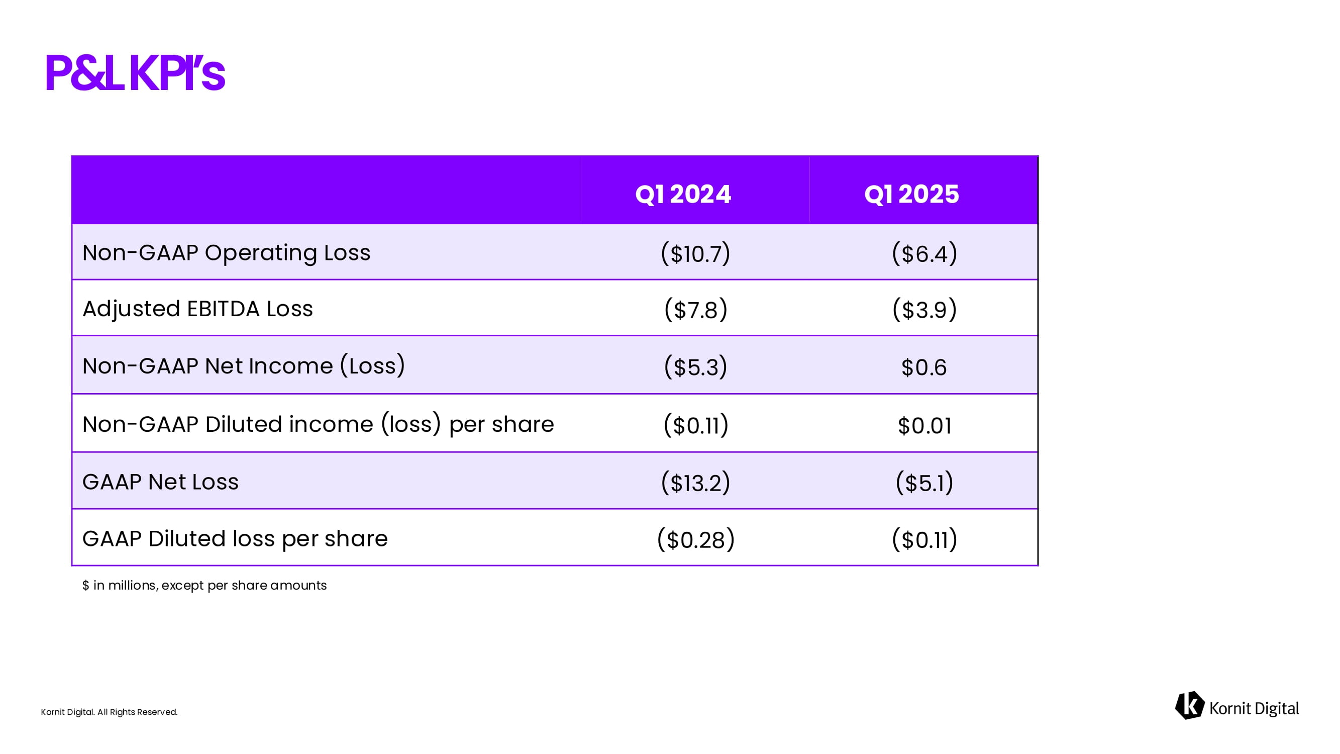 Kornit Digital. All Rights Reserved. P&L KPI’s Q1 2025 Q1 2024 ($6.4) ($10.7) Non - GAAP Operating Loss ($3.9) ($7.8) Adjusted EBITDA Loss $0.6 ($5.3) Non - GAAP Net Income (Loss) $0.01 ($0.11) Non - GAAP Diluted income (loss) per share ($5.1) ($13.2) GAAP Net Loss ($0.11) ($0.28) GAAP Diluted loss per share $ in millions, except per share amounts