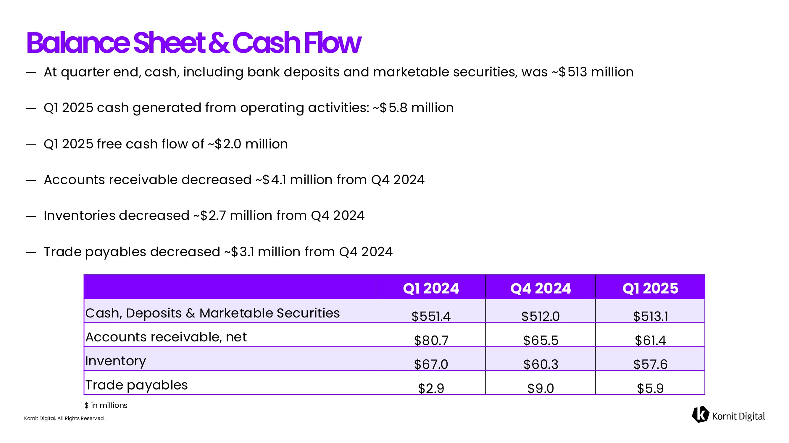 Kornit Digital. All Rights Reserved. ― At quarter end, cash, including bank deposits and marketable securities, was ~$ 513 million ― Q 1 2025 cash generated from operating activities: ~$ 5.8 million ― Q 1 2025 free cash flow of ~$ ʥ . ʣ million ― Accounts receivable decreased ~$ 4.1 million from Q 4 2024 ― Inventories decreased ~$ 2.7 million from Q 4 2024 ― Trade payables decreased ~$ 3.1 million from Q 4 2024 Balance Sheet & Cash Flow Q1 2025 Q4 2024 Q1 2024 $513.1 $512.0 $551.4 Cash, Deposits & Marketable Securities $61.4 $65.5 $80.7 Accounts r eceivable, net $57.6 $60.3 $67.0 Inventory $5.9 $9.0 $2.9 Trade p ayables $ in millions