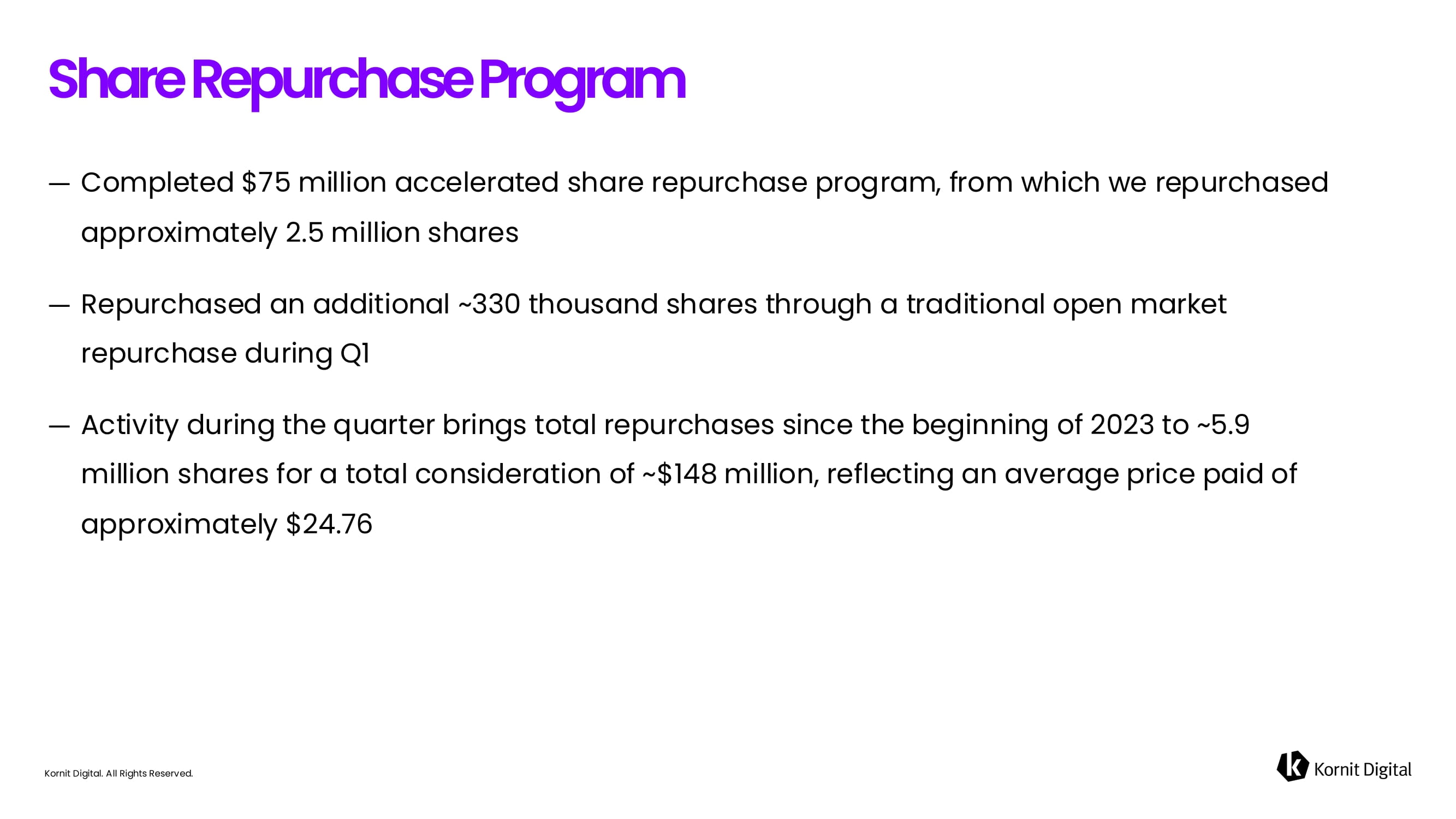 Kornit Digital. All Rights Reserved. ― Completed $75 million accelerated share repurchase program, from which we repurchased approximately 2.5 million shares ― Repurchased an additional ~330 thousand shares through a traditional open market repurchase during Q1 ― Activity during the quarter brings total repurchases since the beginning of 2023 to ~5.9 million shares for a total consideration of ~$148 million, reflecting an average price paid of approximately $24.76 Share Repurchase Program