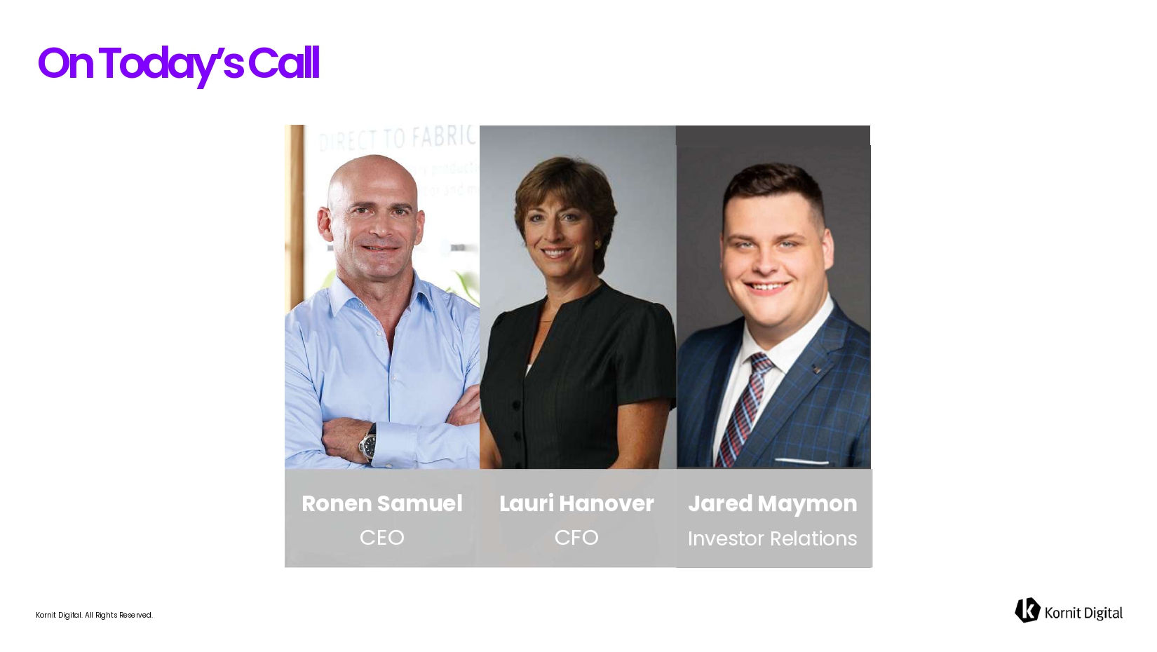 Kornit Digital. All Rights Reserved. On Today ’ s Call Ronen Samuel CEO Lauri Hanover CFO Jared Maymon Investor Relations