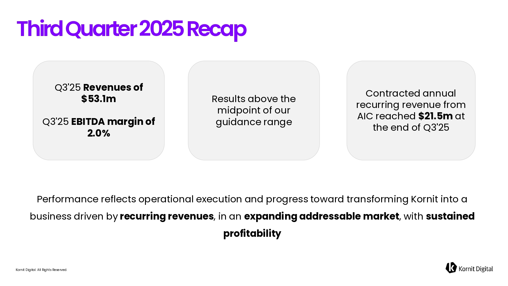 Kornit Digital. All Rights Reserved. Performance reflects operational execution and progress toward transforming Kornit into a business driven by recurring revenues , in an expanding addressable market , with sustained profitability Third Quarter 2025 Recap Q3'25 Revenues of $53.1m Q3'25 EBITDA margin of 2.0% Results above the midpoint of our guidance range Contracted annual recurring revenue from AIC reached $21.5m at the end of Q3'25