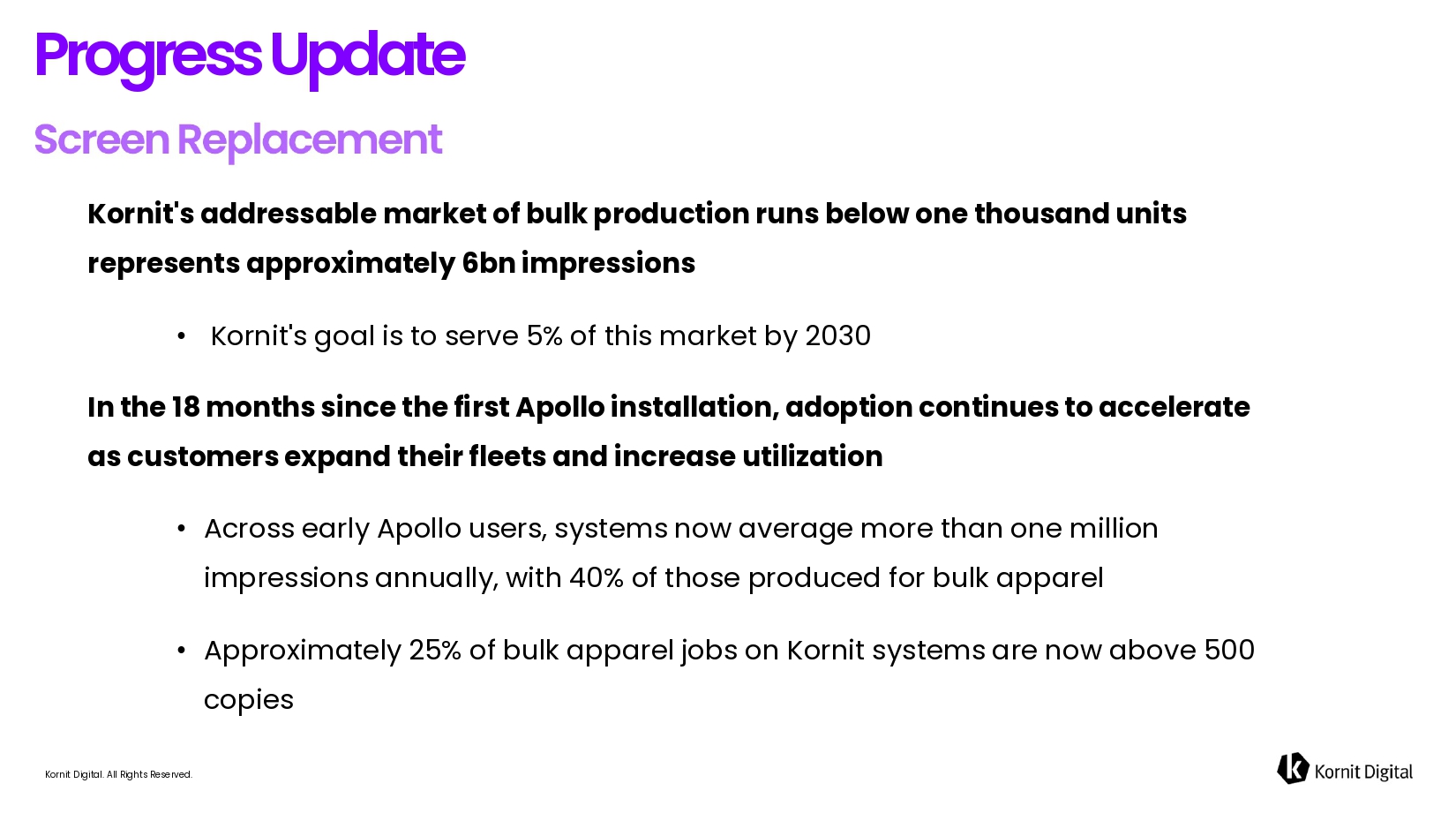 Kornit Digital. All Rights Reserved. Kornit's addressable market of bulk production runs below one thousand units represents approximately 6bn impressions • Kornit's goal is to serve 5% of this market by 2030 In the 18 months since the first Apollo installation, adoption continues to accelerate as customers expand their fleets and increase utilization • Across early Apollo users, systems now average more than one million impressions annually, with 40% of those produced for bulk apparel • Approximately 25% of bulk apparel jobs on Kornit systems are now above 500 copies Progress Update