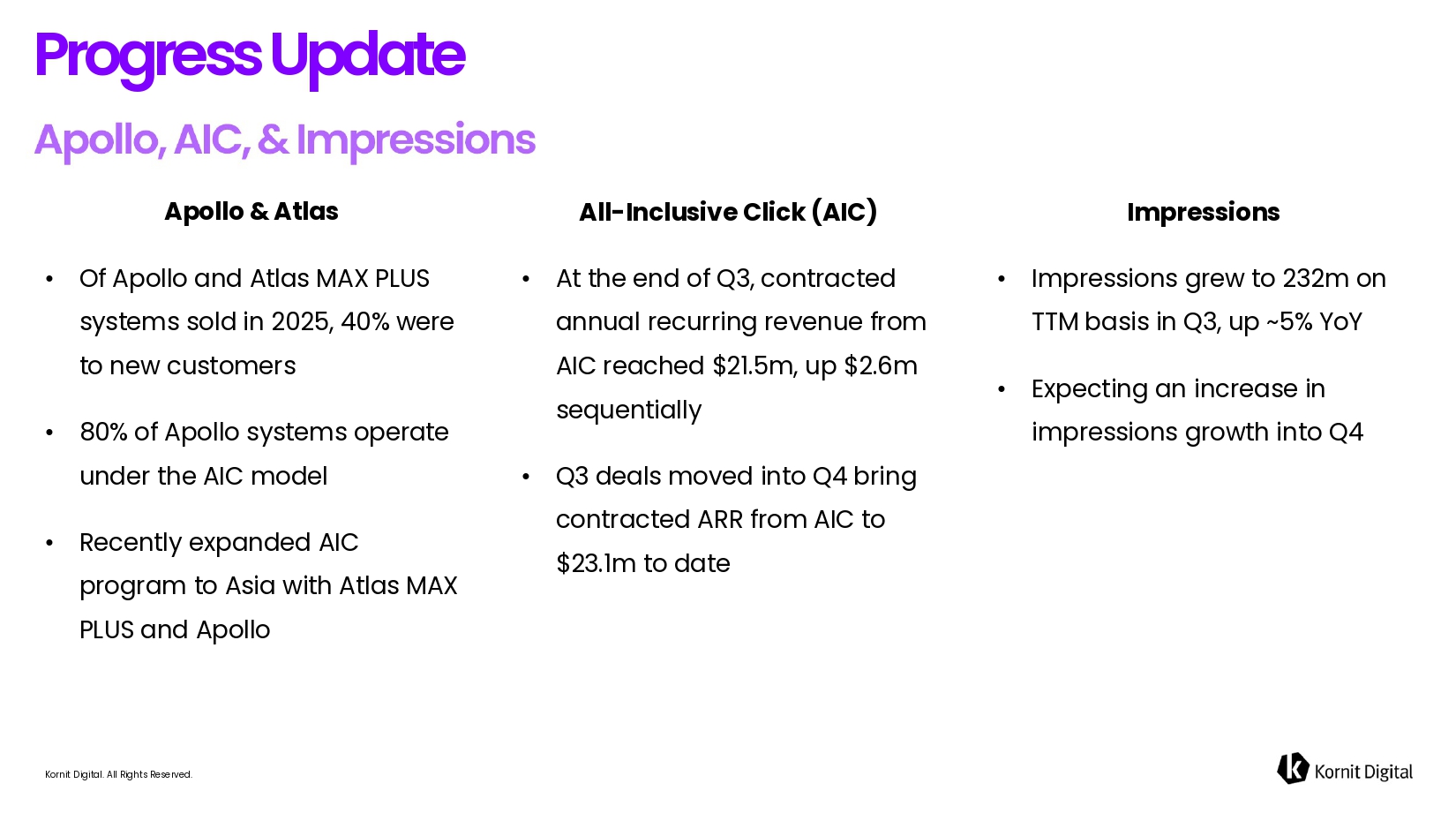 Kornit Digital. All Rights Reserved. Apollo & Atlas • Of Apollo and Atlas MAX PLUS systems sold in 2025 , 40 % were to new customers • 80 % of Apollo systems operate under the AIC model • Recently expanded AIC program to Asia with Atlas MAX PLUS and Apollo Progress Update All - Inclusive Click (AIC) • At the end of Q3, contracted annual recurring revenue from AIC reached $21.5m, up $2.6m sequentially • Q3 deals moved into Q4 bring contracted ARR from AIC to $23.1m to date Impressions • Impressions grew to 232m on TTM basis in Q3, up ~5% YoY • Expecting an increase in impressions growth into Q4