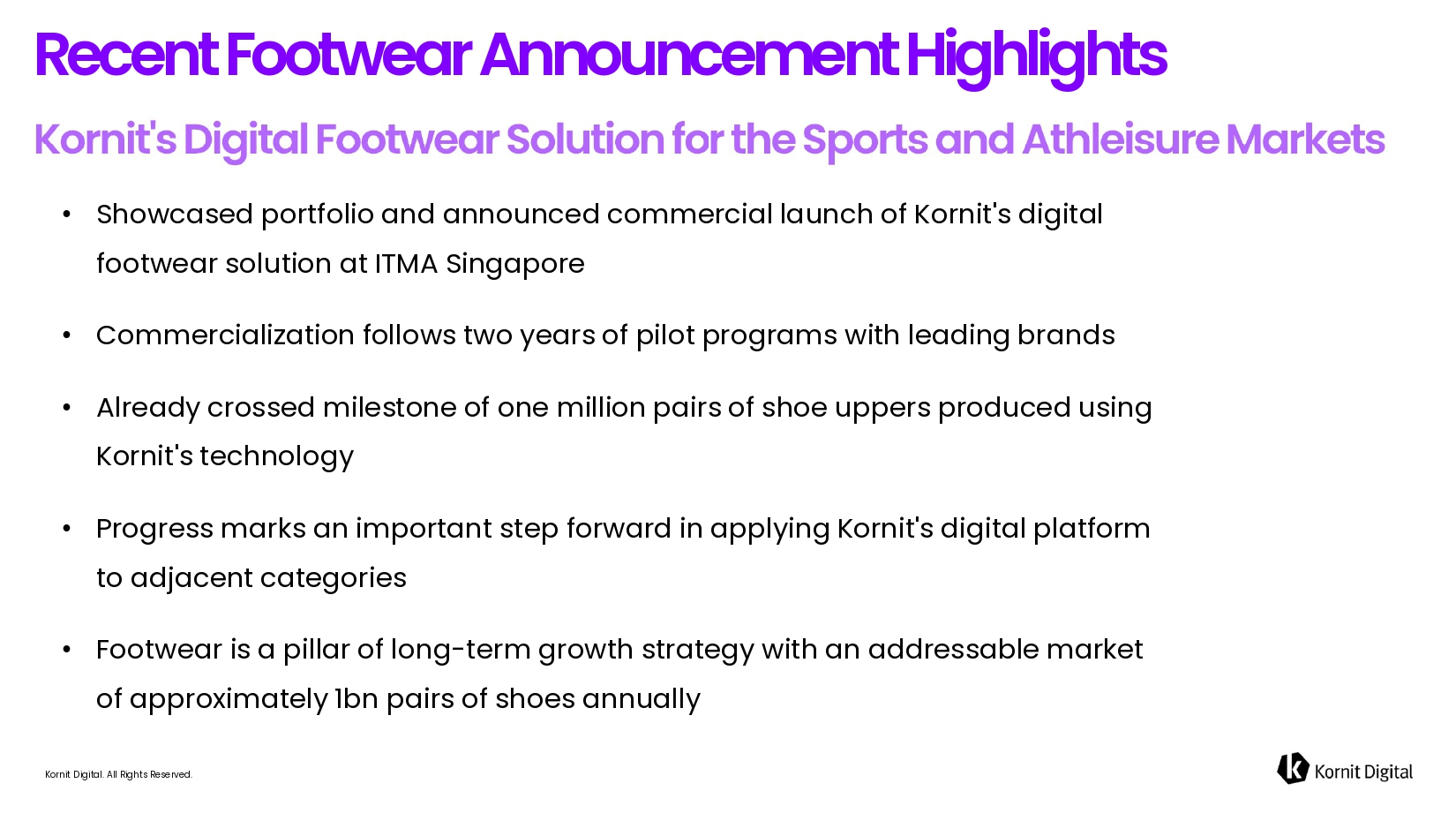 Kornit Digital. All Rights Reserved. • Showcased portfolio and announced commercial launch of Kornit's digital footwear solution at ITMA Singapore • Commercialization follows two years of pilot programs with leading brands • Already crossed milestone of one million pairs of shoe uppers produced using Kornit's technology • Progress marks an important step forward in applying Kornit's digital platform to adjacent categories • Footwear is a pillar of long - term growth strategy with an addressable market of approximately 1 bn pairs of shoes annually Recent Footwear Announcement Highlights