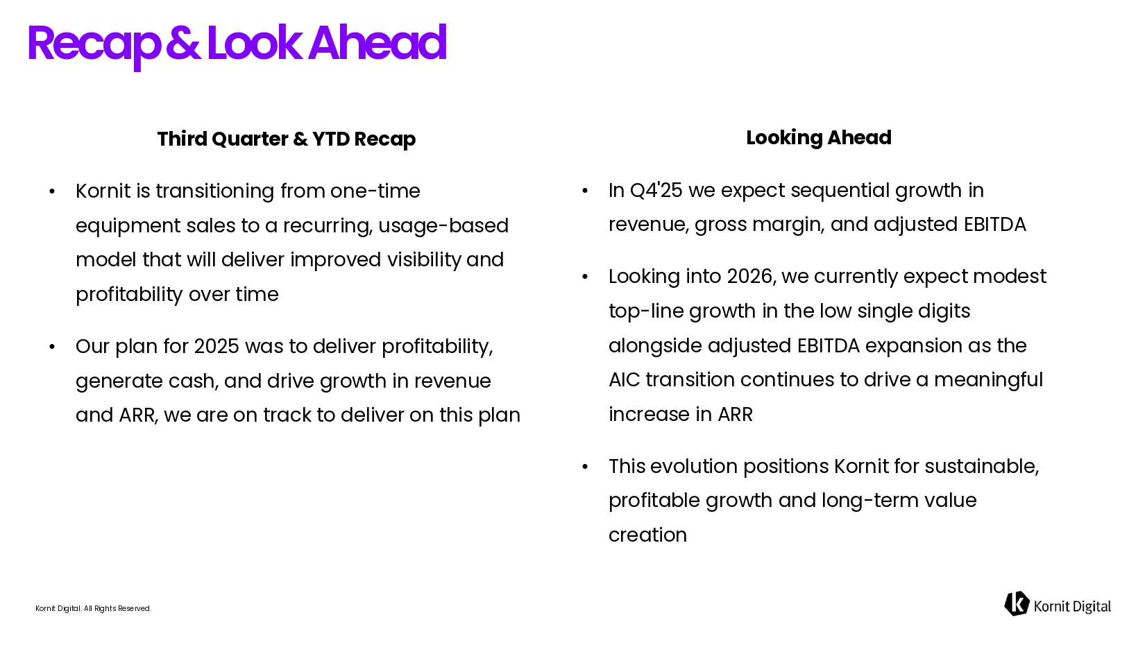 Kornit Digital. All Rights Reserved. Third Quarter & YTD Recap • Kornit is transitioning from one - time equipment sales to a recurring, usage - based model that will deliver improved visibility and profitability over time • Our plan for 2025 was to deliver profitability, generate cash, and drive growth in revenue and ARR, we are on track to deliver on this plan Recap & Look Ahead Looking Ahead • In Q4'25 we expect sequential growth in revenue, gross margin, and adjusted EBITDA • Looking into 2026, we currently expect modest top - line growth in the low single digits alongside adjusted EBITDA expansion as the AIC transition continues to drive a meaningful increase in ARR • This evolution positions Kornit for sustainable, profitable growth and long - term value creation