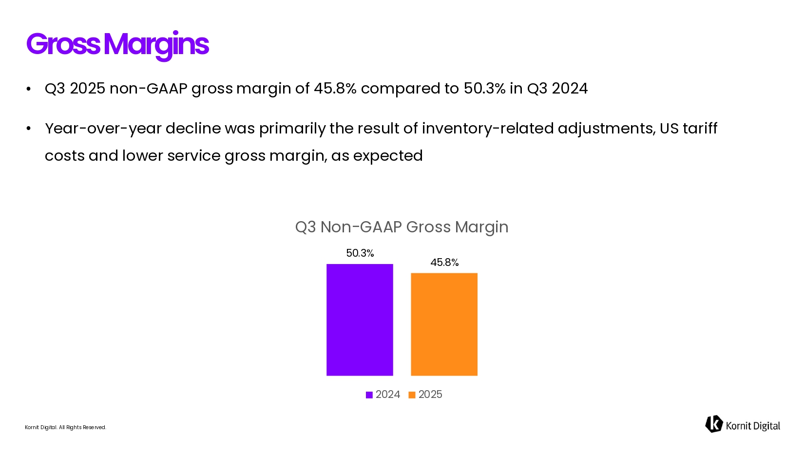 Kornit Digital. All Rights Reserved. • Q3 2025 non - GAAP gross margin of 45.8% compared to 50.3% in Q3 2024 • Year - over - year decline was primarily the result of inventory - related adjustments, US tariff costs and lower service gross margin, as expected Gross Margins 50.3 % 45.8% Q 3 Non - GAAP Gross Margin 2024 2025