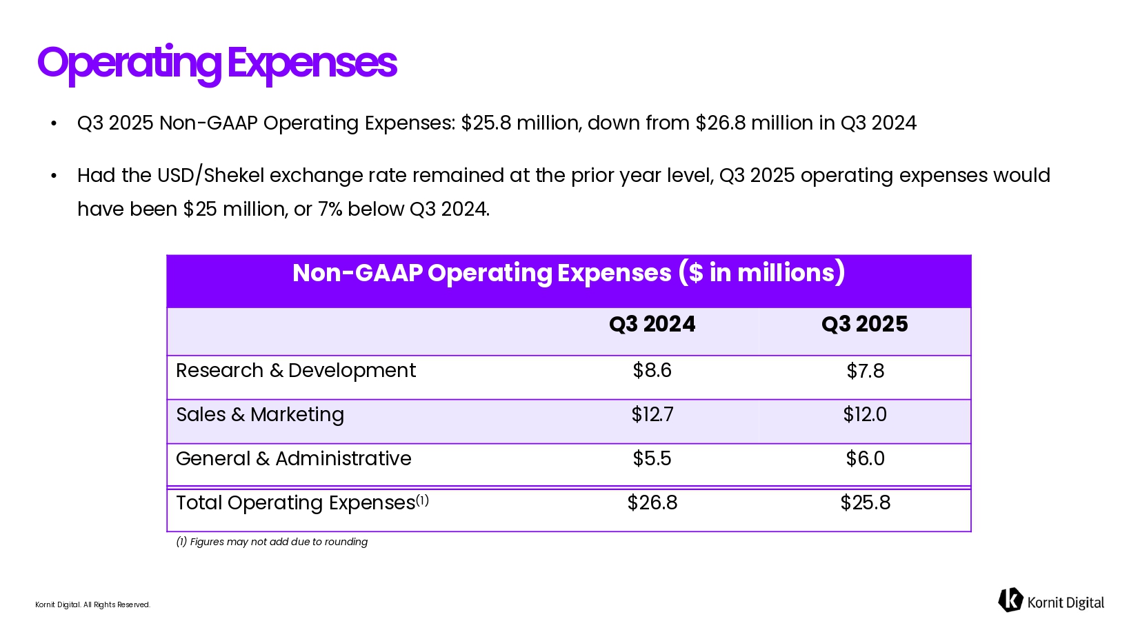 Kornit Digital. All Rights Reserved. • Q3 2025 Non - GAAP Operating Expenses: $25.8 million, down from $26.8 million in Q3 2024 • Had the USD/Shekel exchange rate remained at the prior year level, Q3 2025 operating expenses would have been $25 million, or 7% below Q3 2024. Operating Expenses Non - GAAP Operating Expenses ($ in millions) Q3 2025 Q3 2024 $  .8 $8.6 Research & Development $12.0 $12.7 Sales & Marketing $6.0 $5.5 General & Administrative $25.8 $26.8 Total Operating Expenses (1) ( 1 ) Figures may not add due to rounding