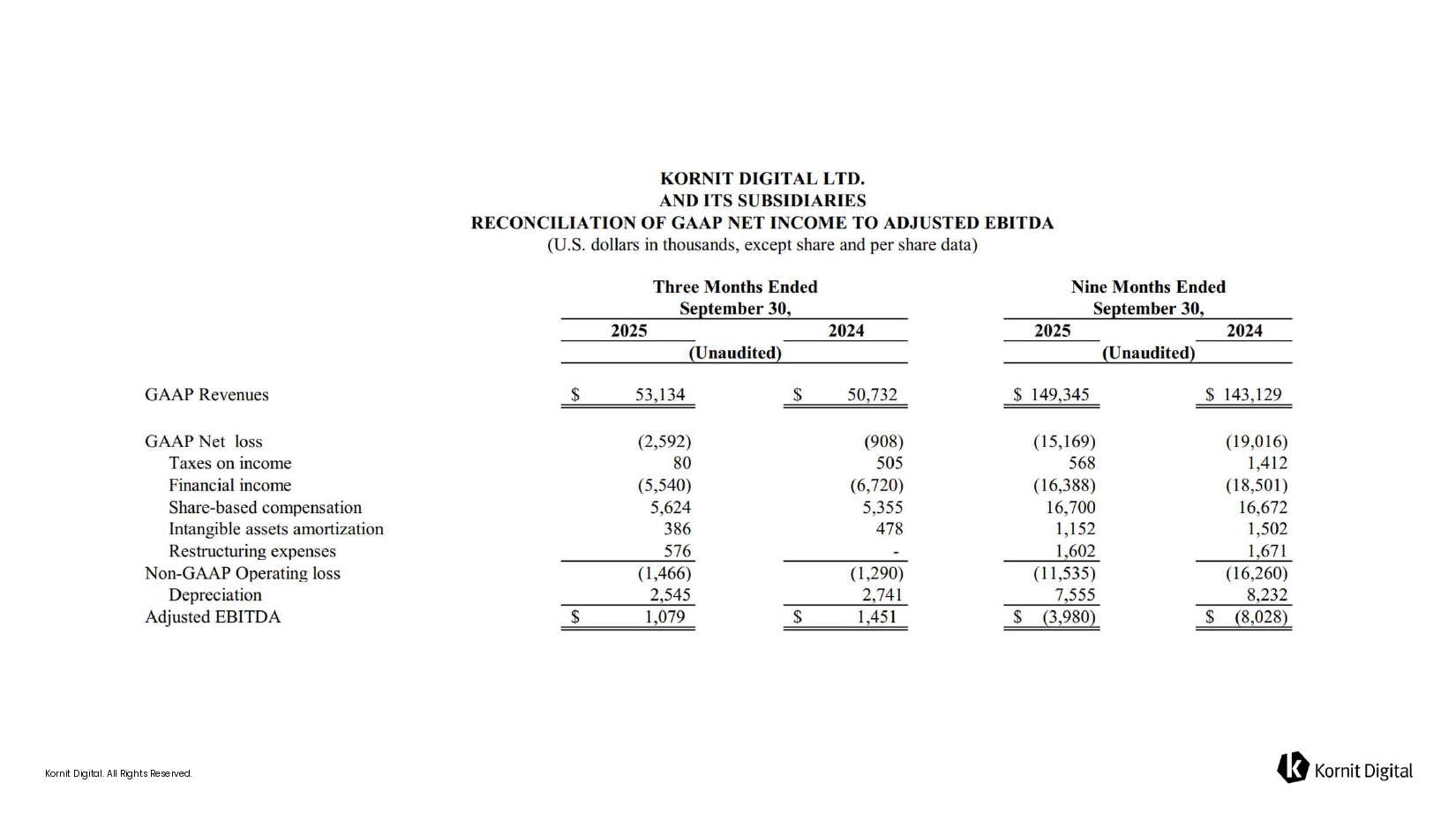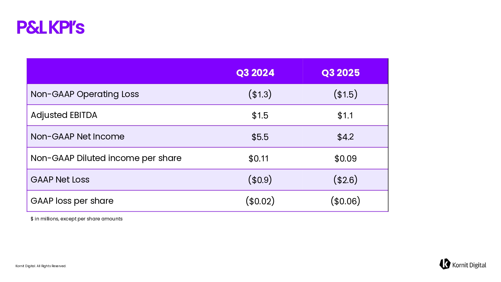 Kornit Digital. All Rights Reserved. P&L KPI’s Q3 2025 Q3 2024 ($  .5 ) ($  .  ) Non - GAAP Operating Loss $  .  $  .5 Adjusted EBITDA $ 4.  $5.5 Non - GAAP Net Income $0.09 $ 0 .   Non - GAAP Diluted income per share ($2.6) ($ 0.  ) GAAP Net Loss ($0.06) ($0.02) GAAP loss per share $ in millions, except per share amounts