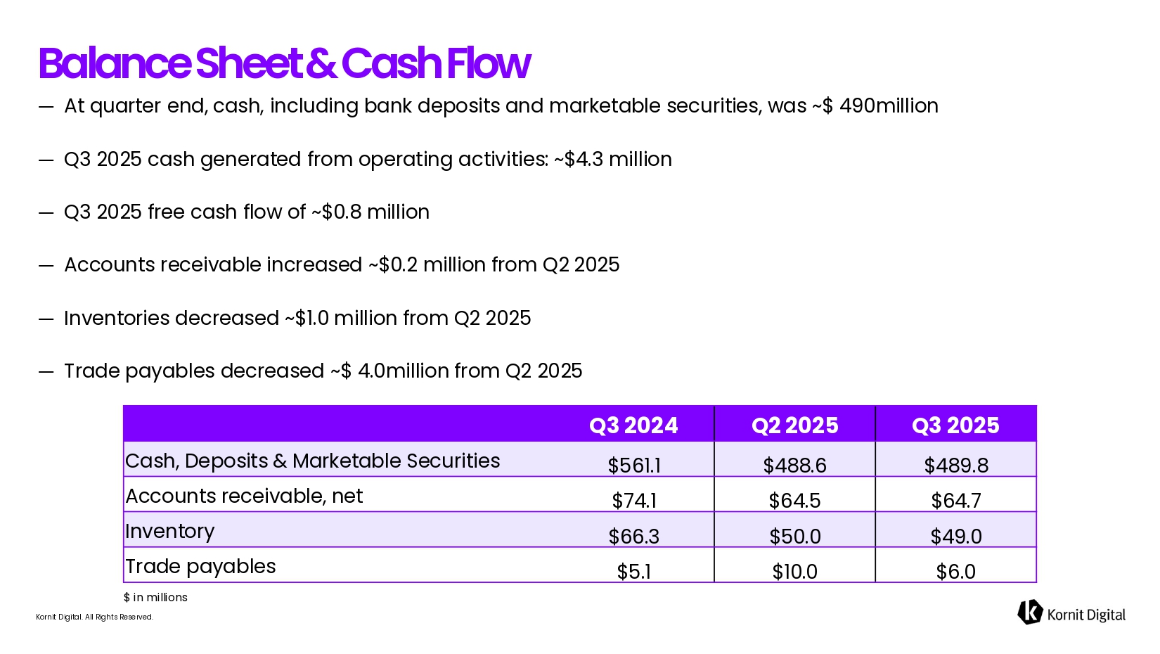 Kornit Digital. All Rights Reserved. ― At quarter end, cash, including bank deposits and marketable securities, was ~$ ʧ 90 million ― Q 3 2025 cash generated from operating activities: ~$ 4.3 million ― Q 3 2025  free cash flow of ~$ 0.8 million ― Accounts receivable increase d ~$ 0.2 million from Q 2 2025 ― Inventories decreased ~$ 1.0 million from Q 2 202 ʨ ― Trade payables decreased ~$ ʧ .0 million from Q 2 202 ʨ Balance Sheet & Cash Flow Q3 2025 Q2 2025 Q3 2024 $489.8 $488.6 $561.1 Cash, Deposits & Marketable Securities $64.7 $64.5 $74.1 Accounts r eceivable, net $49.0 $50.0 $66.3 Inventory $6.0 $10.0 $5.1 Trade p ayables $ in millions