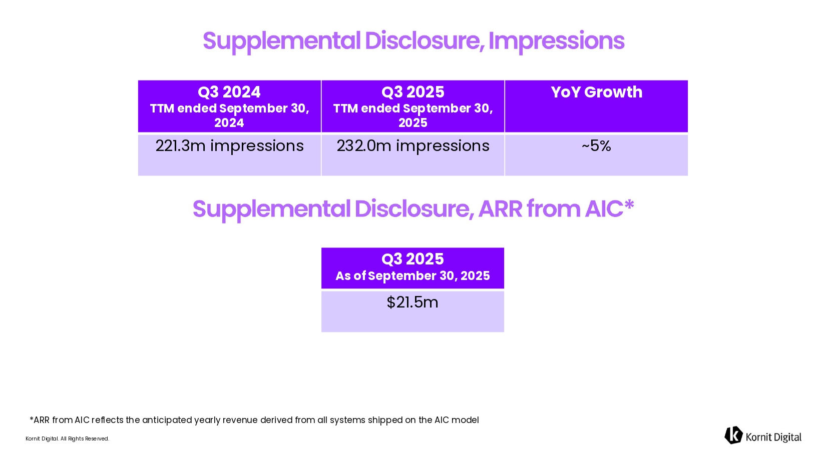 Kornit Digital. All Rights Reserved. YoY Growth Q3 2025 TTM ended September 30, 2025 Q3 2024 TTM ended September 30, 2024 ~5% 232.0m impressions 221.3m impressions Q3 2025 As of September 30, 2025 $21.5m *ARR from AIC reflects the anticipated yearly revenue derived from all systems shipped on the AIC model