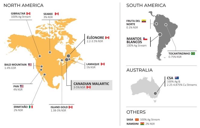 OR Royalties is engaged in the business of acquiring and managing royalties, streams and similar interests on precious metals and other commodities that fit the Company's risk/reward objectives. The Company owns a portfolio of royalties, streams, options on royalty/stream financings and exclusive rights to participate in future royalty/stream financings on various projects. The Company's cornerstone asset is a 3-5% net smelter return ("NSR") royalty on the Canadian Malartic Complex, located in Québec, Canada.