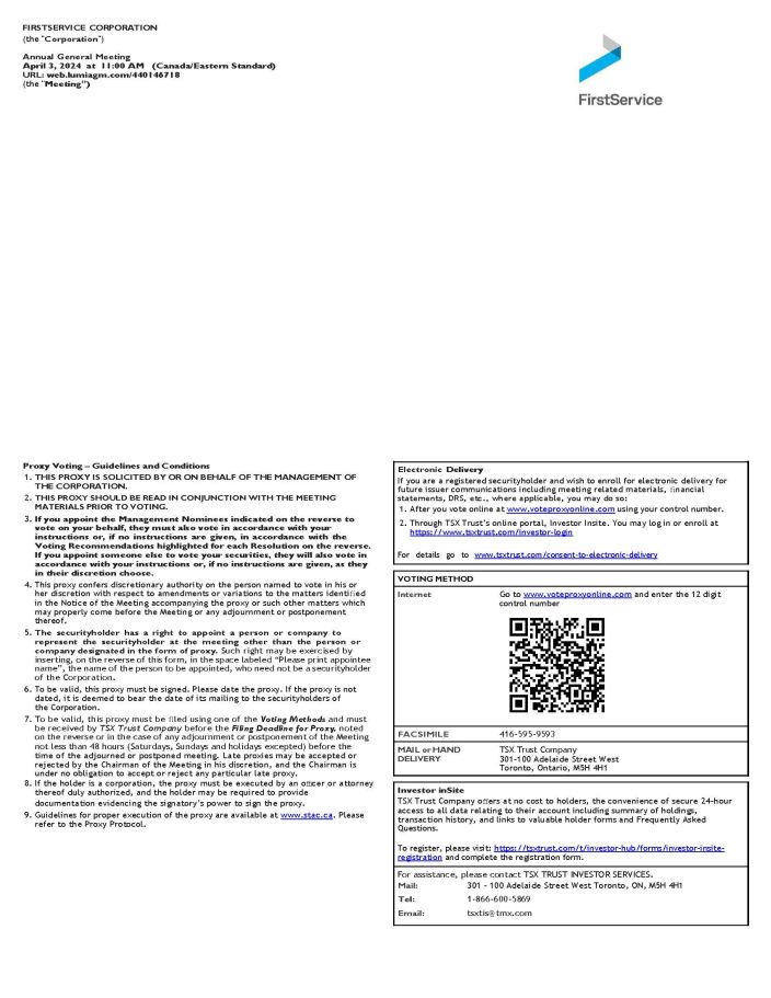 VOTING METHOD Internet Go to www.voteproxyonline.com and enter the 12 digit control number FACSIMILE 416 - 595 - 9593 MAIL or HAND TSX Trust Company DELIVERY 301 - 100 Adelaide Street West Toronto, Ontario, M5H 4H1 FIRSTSERVICE CORPORATION (the " Corporation ") Annual General Meeting April 3, 2024 at 11:00 AM (Canada/Eastern Standard) URL: web.lumiagm.com/440146718 (the " Meeting ” ) Proxy Voting – Guidelines and Conditions 1. THIS PROXY IS SOLICITED BY OR ON BEHALF OF THE MANAGEMENT OF THE CORPORATION. 2. THIS PROXY SHOULD BE READ IN CONJUNCTION WITH THE MEETING MATERIALS PRIOR TO VOTING. 3. If you appoint the Management Nominees indicated on the reverse to vote on your behalf, they must also vote in accordance with your instructions or, if no instructions are given, in accordance with the Voting Recommendations highlighted for each Resolution on the reverse. If you appoint someone else to vote your securities, they will also vote in accordance with your instructions or, if no instructions are given, as they in their discretion choose. 4. This proxy confers discretionary authority on the person named to vote in his or her discretion with respect to amendments or variations to the matters identi fi ed in the Notice of the Meeting accompanying the proxy or such other matters which may properly come before the Meeting or any adjournment or postponement thereof. 5. The securityholder has a right to appoint a person or company to represent the securityholder at the meeting other than the person or company designated in the form of proxy. Such right may be exercised by inserting, on the reverse of this form, in the space labeled “Please print appointee name”, the name of the person to be appointed, who need not be a securityholder of the Corporation. 6. To be valid, this proxy must be signed. Please date the proxy. If the proxy is not dated, it is deemed to bear the date of its mailing to the securityholders of the Corporation. 7. To be valid, this proxy must be fi led using one of the Voting Methods and must be received by TSX Trust Company before the Filing Deadline for Proxy, noted on the reverse or in the case of any adjournment or postponement of the Meeting not less than 48 hours (Saturdays, Sundays and holidays excepted) before the time of the adjourned or postponed meeting. Late proxies may be accepted or rejected by the Chairman of the Meeting in his discretion, and the Chairman is under no obligation to accept or reject any particular late proxy. 8. If the holder is a corporation, the proxy must be executed by an o ffi cer or attorney thereof duly authorized, and the holder may be required to provide documentation evidencing the signatory’s power to sign the proxy. 9. Guidelines for proper execution of the proxy are available at www.stac.ca . Please refer to the Proxy Protocol. Electronic Delivery If you are a registered securityholder and wish to enroll for electronic delivery for future issuer communications including meeting related materials, fi nancial statements, DRS, etc., where applicable, you may do so: 1. After you vote online at www.voteproxyonline.com using your control number. 2. Through TSX Trust’s online portal, Investor Insite. You may log in or enroll at https://www.tsxtrust.com/investor - login For details go to www.tsxtrust.com/consent - to - electronic - delivery Investor inSite TSX Trust Company o ff ers at no cost to holders, the convenience of secure 24 - hour access to all data relating to their account including summary of holdings, transaction history, and links to valuable holder forms and Frequently Asked Questions. To register, please visit: https://tsxtrust.com/t/investor - hub/forms/investor - insite - registration and complete the registration form. For assistance, please contact TSX TRUST INVESTOR SERVICES. Mail: 301 - 100 Adelaide Street West Toronto, ON, M5H 4H1 Tel: 1 - 866 - 600 - 5869 Email: tsxtis@tmx.com
