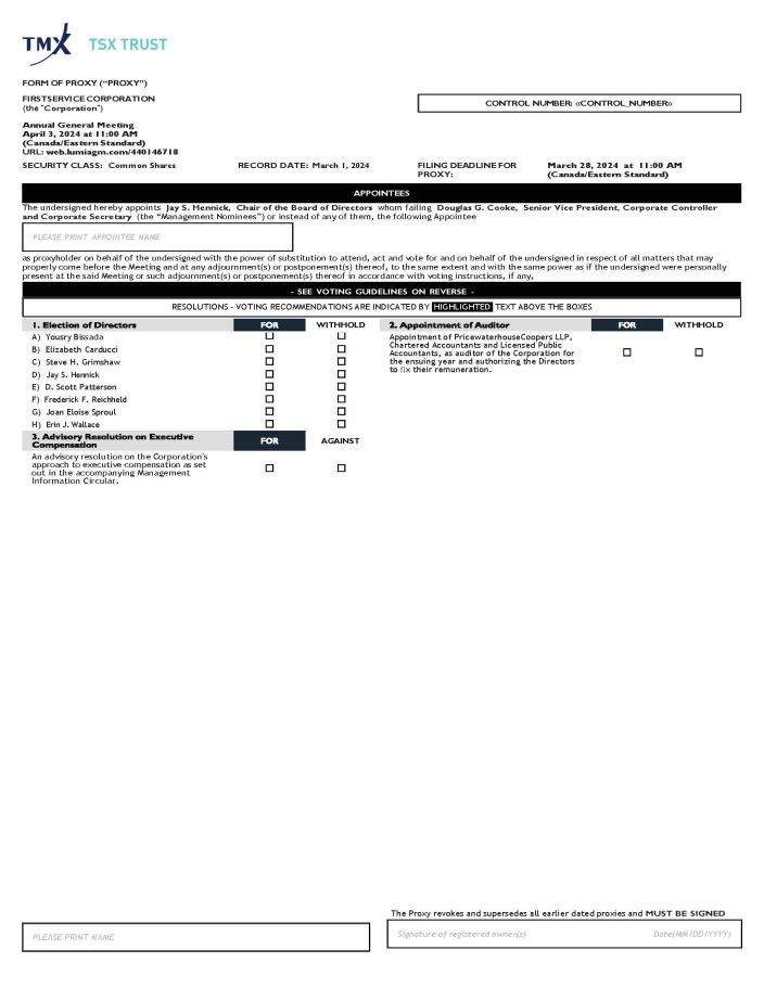 FORM OF PROXY (“PROXY”) FIRSTSERVICE CORPORATION (the " Corporation ") Annual General Meeting April 3, 2024 at 11:00 AM (Canada/Eastern Standard) URL: web.lumiagm.com/440146718 SECURITY CLASS: Common Shares RECORD DATE: March 1, 2024 FILING DEADLINE FOR PROXY: March 28, 2024 at 11:00 AM (Canada/Eastern Standard) The undersigned hereby appoints Jay S. Hennick, Chair of the Board of Directors whom failing Douglas G. Cooke, Senior Vice President, Corporate Controller and Corporate Secretary (the “Management Nominees”) or instead of any of them, the following Appointee PLEASE PRINT APPOINTEE NAME as proxyholder on behalf of the undersigned with the power of substitution to attend, act and vote for and on behalf of the undersigned in respect of all matters that may properly come before the Meeting and at any adjournment(s) or postponement(s) thereof, to the same extent and with the same power as if the undersigned were personally present at the said Meeting or such adjournment(s) or postponement(s) thereof in accordance with voting instructions, if any, A) Yousry Bissada B) Elizabeth Carducci C) Steve H. Grimshaw D) Jay S. Hennick E) D. Scott Patterson F) Frederick F. Reichheld G) Joan Eloise Sproul H) Erin J. Wallace An advisory resolution on the Corporation's approach to executive compensation as set out in the accompanying Management Information Circular. WITHHOLD AGAINST Appointment of PricewaterhouseCoopers LLP, Chartered Accountants and Licensed Public Accountants, as auditor of the Corporation for the ensuing year and authorizing the Directors to fi x their remuneration. WITHHOLD PLEASE PRINT NAME The Proxy revokes and supersedes all earlier dated proxies and MUST BE SIGNED Signature of registered owner(s) Date(MM/DD/YYYY) APPOINTEES - SEE VOTING GUIDELINES ON REVERSE - RESOLUTIONS - VOTING RECOMMENDATIONS ARE INDICATED BY HIGHLIGHTED TEXT ABOVE THE BOXES CONTROL NUMBER: «CONTROL_NUMBER»