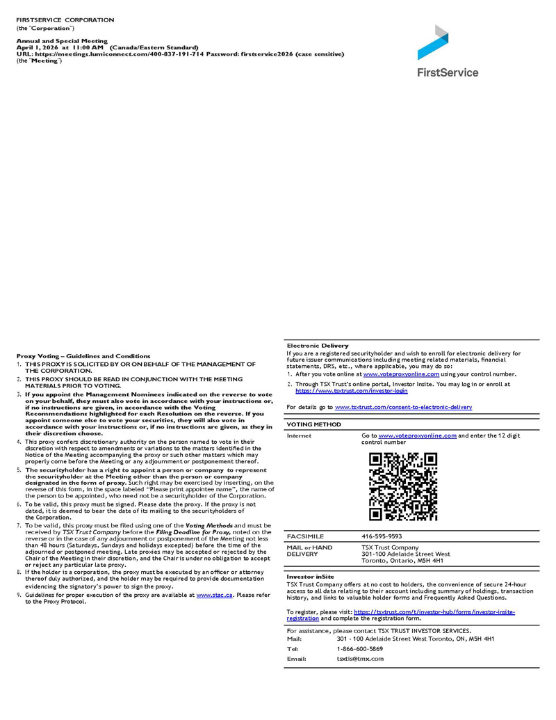 FIRSTSERVICE CORPORATION (the " Corporation ") Annual and Special Meeting April 1, 2026 at 11:00 AM (Canada/Eastern Standard) URL: https://meetings.lumiconnect.com/400 - 837 - 191 - 714 Password: firstservice2026 (case sensitive) (the " Meeting ") Proxy Voting – Guidelines and Conditions 1. THIS PROXY IS SOLICITED BY OR ON BEHALF OF THE MANAGEMENT OF THE CORPORATION. 2. THIS PROXY SHOULD BE READ IN CONJUNCTION WITH THE MEETING MATERIALS PRIOR TO VOTING. 3. If you appoint the Management Nominees indicated on the reverse to vote on your behalf, they must also vote in accordance with your instructions or, if no instructions are given, in accordance with the Voting Recommendations highlighted for each Resolution on the reverse. If you appoint someone else to vote your securities, they will also vote in accordance with your instructions or, if no instructions are given, as they in their discretion choose. 4. This proxy confers discretionary authority on the person named to vote in their discretion with respect to amendments or variations to the matters identified in the Notice of the Meeting accompanying the proxy or such other matters which may properly come before the Meeting or any adjournment or postponement thereof. 5. The securityholder has a right to appoint a person or company to represent the securityholder at the Meeting other than the person or company designated in the form of proxy. Such right may be exercised by inserting, on the reverse of this form, in the space labeled “Please print appointee name”, the name of the person to be appointed, who need not be a securityholder of the Corporation. 6. To be valid, this proxy must be signed. Please date the proxy. If the proxy is not dated, it is deemed to bear the date of its mailing to the securityholders of the Corporation. 7. To be valid, this proxy must be filed using one of the Voting Methods and must be received by TSX Trust Company before the Filing Deadline for Proxy, noted on the reverse or in the case of any adjournment or postponement of the Meeting not less than 48 hours (Saturdays, Sundays and holidays excepted) before the time of the adjourned or postponed meeting. Late proxies may be accepted or rejected by the Chair of the Meeting in their discretion, and the Chair is under no obligation to accept or reject any particular late proxy. 8. If the holder is a corporation, the proxy must be executed by an officer or attorney thereof duly authorized, and the holder may be required to provide documentation evidencing the signatory’s power to sign the proxy. 9. Guidelines for proper execution of the proxy are available at www.stac.ca . Please refer to the Proxy Protocol. Electronic Delivery If you are a registered securityholder and wish to enroll for electronic delivery for future issuer communications including meeting related materials, financial statements, DRS, etc., where applicable, you may do so: 1. After you vote online at www.voteproxyonline.com using your control number. 2. Through TSX Trust’s online portal, Investor Insite. You may log in or enroll at https://www.tsxtrust.com/investor - login For details go to www.tsxtrust.com/consent - to - electronic - delivery VOTING METHOD Internet Go to www.voteproxyonline.com and enter the 12 digit control number FACSIMILE 416 - 595 - 9593 MAIL or HAND DELIVERY Investor inSite TSX Trust Company offers at no cost to holders, the convenience of secure 24 - hour access to all data relating to their account including summary of holdings, transaction history, and links to valuable holder forms and Frequently Asked Questions. TSX Trust Company 301 - 100 Adelaide Street West Toronto, Ontario, M5H 4H1 To register, please visit: https://tsxtrust.com/t/investor - hub/forms/investor - insite - registration and complete the registration form. For assistance, please contact TSX TRUST INVESTOR SERVICES. Mail: Tel: Email: 301 - 100 Adelaide Street West Toronto, ON, M5H 4H1 1 - 866 - 600 - 5869 tsxtis@tmx.com