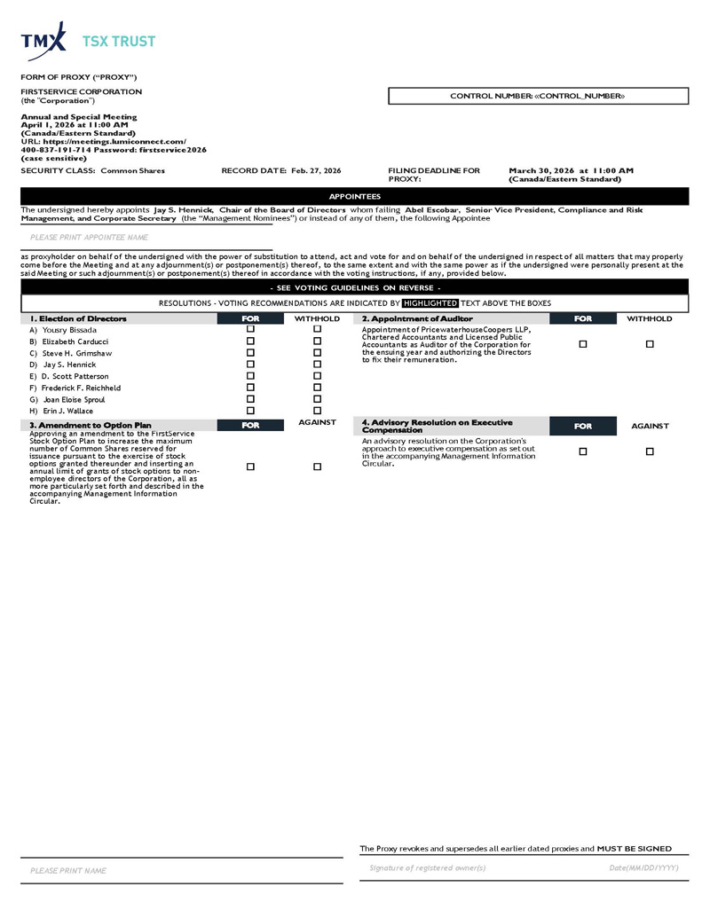 FORM OF PROXY (“PROXY”) FIRSTSERVICE CORPORATION (the " Corporation ") Annual and Special Meeting April 1, 2026 at 11:00 AM (Canada/Eastern Standard) URL: https://meetings.lumiconnect.com/ 400 - 837 - 191 - 714 Password: firstservice2026 (case sensitive) SECURITY CLASS: Common Shares RECORD DATE: Feb. 27, 2026 FILING DEADLINE FOR PROXY: March 30, 2026 at 11:00 AM (Canada/Eastern Standard) The undersigned hereby appoints Jay S. Hennick, Chair of the Board of Directors whom failing Abel Escobar, Senior Vice President, Compliance and Risk Management, and Corporate Secretary (the “Management Nominees”) or instead of any of them, the following Appointee PLEASE PRINT APPOINTEE NAME as proxyholder on behalf of the undersigned with the power of substitution to attend, act and vote for and on behalf of the undersigned in respect of all matters that may properly come before the Meeting and at any adjournment(s) or postponement(s) thereof, to the same extent and with the same power as if the undersigned were personally present at the said Meeting or such adjournment(s) or postponement(s) thereof in accordance with the voting instructions, if any, provided below . A) Yousry Bissada B) Elizabeth Carducci C) Steve H. Grimshaw D) Jay S. Hennick E) D. Scott Patterson F) Frederick F. Reichheld G) Joan Eloise Sproul H) Erin J. Wallace Approving an amendment to the FirstService Stock Option Plan to increase the maximum number of Common Shares reserved for issuance pursuant to the exercise of stock options granted thereunder and inserting an annual limit of grants of stock options to non - employee directors of the Corporation, all as more particularly set forth and described in the accompanying Management Information Circular. WITHHOLD AGAINST Appointment of PricewaterhouseCoopers LLP, Chartered Accountants and Licensed Public Accountants as Auditor of the Corporation for the ensuing year and authorizing the Directors to fix their remuneration. An advisory resolution on the Corporation's approach to executive compensation as set out in the accompanying Management Information Circular. WITHHOLD AGAINST PLEASE PRINT NAME The Proxy revokes and supersedes all earlier dated proxies and MUST BE SIGNED Signature of registered owner(s) Date(MM/DD/YYYY) APPOINTEES - SEE VOTING GUIDELINES ON REVERSE - RESOLUTIONS - VOTING RECOMMENDATIONS ARE INDICATED BY HIGHLIGHTED TEXT ABOVE THE BOXES CONTROL NUMBER: «CONTROL_NUMBER»