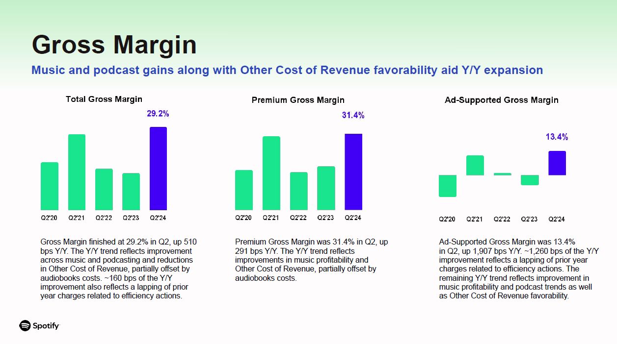 Premium Gross Margin was 31.4% in Q2, up 291 bps Y/Y. The Y/Y trend reflects improvements in music profitability and Other Cost of Revenue, partially offset by audiobooks costs.  Gross Margin  Music and podcast gains along with Other Cost of Revenue favorability aid Y/Y expansion  Gross Margin finished at 29.2% in Q2, up 510 bps Y/Y. The Y/Y trend reflects improvement across music and podcasting and reductions in Other Cost of Revenue, partially offset by audiobooks costs. ~160 bps of the Y/Y improvement also reflects a lapping of prior year charges related to efficiency actions.  Ad-Supported Gross Margin was 13.4%  in Q2, up 1,907 bps Y/Y. ~1,260 bps of the Y/Y improvement reflects a lapping of prior year charges related to efficiency actions. The remaining Y/Y trend reflects improvement in music profitability and podcast trends as well as Other Cost of Revenue favorability.