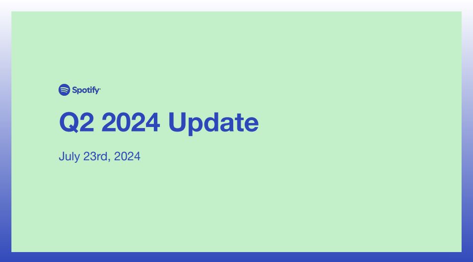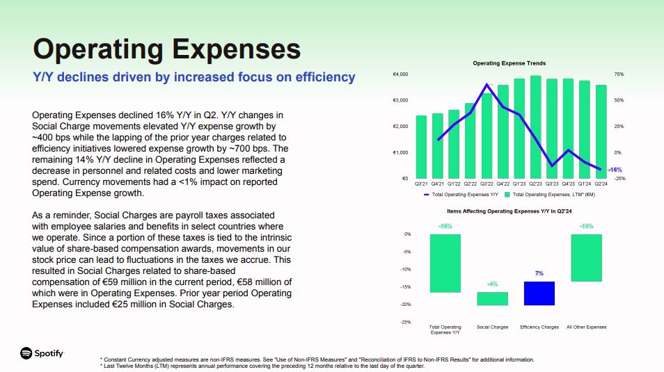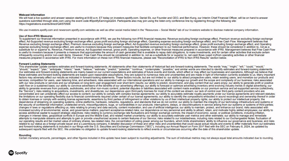 Webcast Information  We will host a live question and answer session starting at 8:00 a.m. ET today on investors.spotify.com. Daniel Ek, our Founder and CEO, and Ben Kung, our Interim Chief Financial Officer, will be on hand to answer questions submitted through slido.com using the event code #SpotifyEarningsQ224. Participants also may join using the listen-only conference line by registering through the following site: https://registrations.events/direct/Q4I570506  We use investors.spotify.com and newsroom.spotify.com websites as well as other social media listed in the “Resources – Social Media” tab of our Investors website to disclose material company information.  Use of Non-IFRS Measures  To supplement our financial information presented in accordance with IFRS, we use the following non-IFRS financial measures: Revenue excluding foreign exchange effect, Premium revenue excluding foreign exchange effect, Ad-Supported revenue excluding foreign exchange effect, gross profit excluding foreign exchange effect, Operating expense excluding foreign exchange effect, and Free Cash Flow. Management believes that Revenue excluding foreign exchange effect, Premium revenue excluding foreign exchange effect, Ad-Supported revenue excluding foreign exchange effect, gross profit excluding foreign exchange effect, and Operating expense excluding foreign exchange effect, are useful to investors because they present measures that facilitate comparison to our historical performance. However, these should be considered in addition to, not as a substitute for or superior to, Revenue, Premium revenue, Ad-Supported revenue, gross profit, Operating expense, or other financial measures prepared in accordance with IFRS. Management believes that Free Cash Flow is useful to investors because it presents a measure that approximates the amount of cash generated that is available to repay debt obligations, to make investments, and for certain other activities that exclude certain infrequently occurring and/or non-cash items. However, Free Cash Flow should be considered in addition to, not as a substitute for or superior to, net cash flows (used in)/from operating activities or other financial measures prepared in accordance with IFRS. For more information on these non-IFRS financial measures, please see “Reconciliation of IFRS to Non-IFRS Results” section below.  Forward Looking Statements  This shareholder update contains estimates and forward-looking statements. All statements other than statements of historical fact are forward-looking statements. The words “may,” “might,” “will,” “could,” “would,” “should,” “expect,” “plan,” “anticipate,” “intend,” “seek,” “believe,” “estimate,” “predict,” “potential,” “continue,” “contemplate,” “possible,” and similar words are intended to identify estimates and forward-looking statements. Our estimates and forward-looking statements are mainly based on our current expectations and estimates of future events and trends, which affect or may affect our businesses and operations. Although we believe that these estimates and forward-looking statements are based upon reasonable assumptions, they are subject to numerous risks and uncertainties and are made in light of information currently available to us. Many important factors may adversely affect our results as indicated in forward-looking statements. These factors include, but are not limited to: our ability to attract prospective users, retain existing users, and monetize our products and services; competition for users, user listening time, and advertisers; risks associated with our international operations and our ability to manage our growth and the scope and complexity of our business; risks associated with our new products or services and our emphasis on long-term user engagement over short-term results; our ability to predict, recommend, and play content that our users enjoy; our ability to generate profit or positive cash flow on a sustained basis; our ability to convince advertisers of the benefits of our advertising offerings; our ability to forecast or optimize advertising inventory amid evolving industry trends in digital advertising; our ability to generate revenues from podcasts, audiobooks, and other non-music content; potential disputes or liabilities associated with content made available on our premium service and ad-supported service (collectively, the “Service”); risks relating to acquisitions, investments, and divestitures; our dependence upon third-party licenses for most of the content we stream; our lack of control over third-party content providers who are concentrated and can unilaterally affect our access to content; our ability to comply with complex license agreements; our ability to accurately estimate royalty payments under our license agreements and relevant statutes; the limitations on our operating flexibility due to financial commitments required under certain of our license agreements; our ability to identify the compositions embodied in sound recordings and ownership thereof in order to obtain licenses or comply with existing license agreements; assertions by third parties of infringement or other violations by us of their intellectual property rights; our ability to protect our intellectual property; the dependence of streaming on operating systems, online platforms, hardware, networks, regulations, and standards that we do not control; our ability to maintain the integrity of our technology infrastructure and systems or the security of confidential information; undetected errors, misconfigurations, bugs, or vulnerabilities in our products; interruptions, delays, or discontinuations in service arising from our systems or systems of third parties; changes in laws or regulations affecting us; risks relating to privacy and data security, content moderation, and use of artificial intelligence; our ab