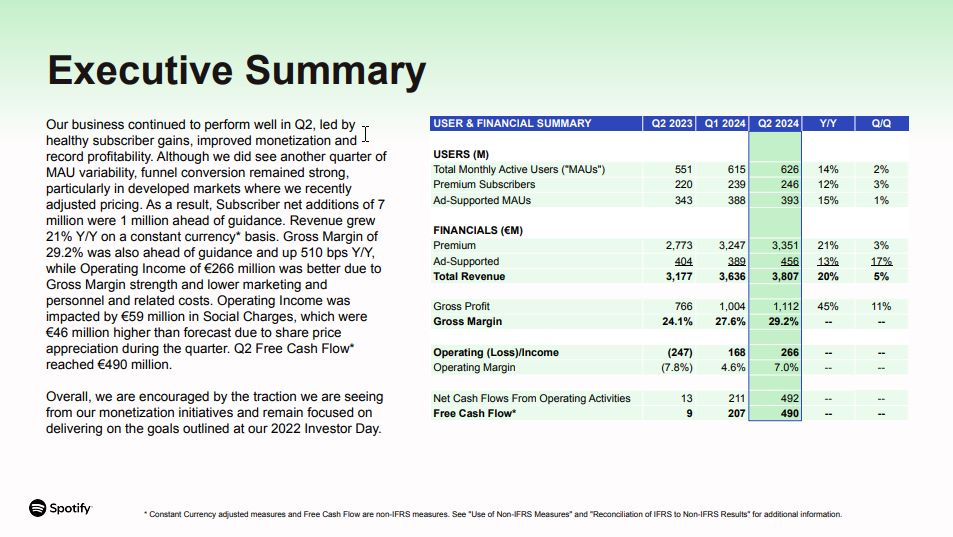 Executive Summary  USER & FINANCIAL SUMMARY  Q2 2023  Q1 2024  Q2 2024  Y/Y  Q/Q  USERS (M)  Total Monthly Active Users ("MAUs")  551  615  626  14%  2%  Premium Subscribers  220  239  246  12%  3%  Ad-Supported MAUs  343  388  393  15%  1%  FINANCIALS (€M)  Premium  2,773  3,247  3,351  21%  3%  Ad-Supported  404  389  456  13%  17%  Total Revenue  3,177  3,636  3,807  20%  5%  Gross Profit  766  1,004  1,112  45%  11%  Gross Margin  24.1%  27.6%  29.2%  --  --  Operating (Loss)/Income  (247)  168  266  --  --  Operating Margin  (7.8%)  4.6%  7.0%  --  --  Net Cash Flows From Operating Activities  13  211  492  --  --  Free Cash Flow*  9  207  490  --  --  * Constant Currency adjusted measures and Free Cash Flow are non-IFRS measures. See "Use of Non-IFRS Measures" and "Reconciliation of IFRS to Non-IFRS Results" for additional information.  Our business continued to perform well in Q2, led by healthy subscriber gains, improved monetization and record profitability. Although we did see another quarter of MAU variability, funnel conversion remained strong, particularly in developed markets where we recently adjusted pricing. As a result, Subscriber net additions of 7 million were 1 million ahead of guidance. Revenue grew 21% Y/Y on a constant currency* basis. Gross Margin of 29.2% was also ahead of guidance and up 510 bps Y/Y, while Operating Income of €266 million was better due to Gross Margin strength and lower marketing and personnel and related costs. Operating Income was impacted by €59 million in Social Charges, which were  €46 million higher than forecast due to share price appreciation during the quarter. Q2 Free Cash Flow* reached €490 million.  Overall, we are encouraged by the traction we are seeing from our monetization initiatives and remain focused on delivering on the goals outlined at our 2022 Investor Day.