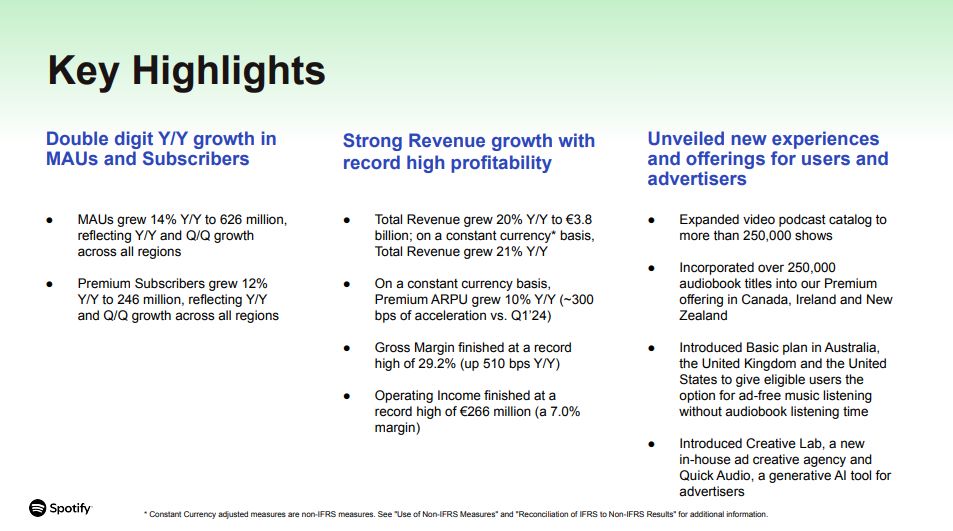 * Constant Currency adjusted measures are non-IFRS measures. See "Use of Non-IFRS Measures" and "Reconciliation of IFRS to Non-IFRS Results" for additional information.  Double digit Y/Y growth in  MAUs and Subscribers  Expanded video podcast catalog to more than 250,000 shows  Incorporated over 250,000 audiobook titles into our Premium offering in Canada, Ireland and New Zealand  Introduced Basic plan in Australia, the United Kingdom and the United States to give eligible users the option for ad-free music listening without audiobook listening time  Introduced Creative Lab, a new in-house ad creative agency and  Quick Audio, a generative AI tool for advertisers  Key Highlights  Strong Revenue growth with  record high profitability  Total Revenue grew 20% Y/Y to €3.8 billion; on a constant currency* basis, Total Revenue grew 21% Y/Y  On a constant currency basis, Premium ARPU grew 10% Y/Y (~300 bps of acceleration vs. Q1’24)  Gross Margin finished at a record high of 29.2% (up 510 bps Y/Y)  Operating Income finished at a record high of €266 million (a 7.0% margin)  Unveiled new experiences  and offerings for users and advertisers  MAUs grew 14% Y/Y to 626 million, reflecting Y/Y and Q/Q growth across all regions  Premium Subscribers grew 12% Y/Y to 246 million, reflecting Y/Y and Q/Q growth across all regions