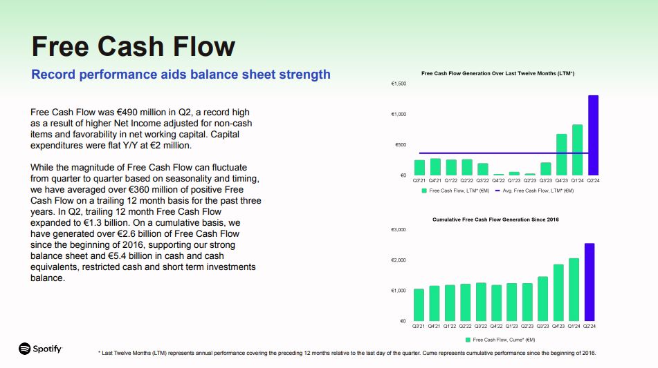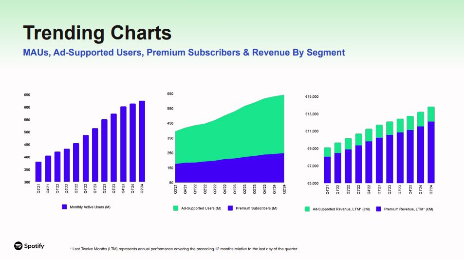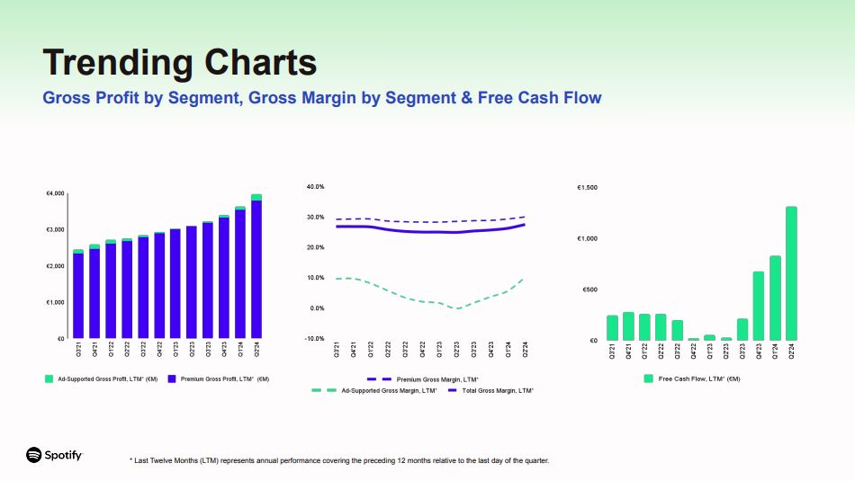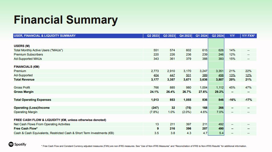 Financial Summary  * Free Cash Flow and Constant Currency adjusted measures (FXN) are non-IFRS measures. See “Use of Non-IFRS Measures” and “Reconciliation of IFRS to Non-IFRS Results” for additional information.  USER, FINANCIAL & LIQUIDITY SUMMARY  Q2 2023  Q3 2023  Q4 2023  Q1 2024  Q2 2024  Y/Y  Y/Y FXN*  USERS (M)  Total Monthly Active Users ("MAUs")  551  574  602  615  626  14%  --  Premium Subscribers  220  226  236  239  246  12%  --  Ad-Supported MAUs  343  361  379  388  393  15%  --  FINANCIALS (€M)  Premium  2,773  2,910  3,170  3,247  3,351  21%  22%  Ad-Supported  404  447  501  389  456  13%  12%  Total Revenue  3,177  3,357  3,671  3,636  3,807  20%  21%  Gross Profit  766  885  980  1,004  1,112  45%  47%  Gross Margin  24.1%  26.4%  26.7%  27.6%  29.2%  --  --  Total Operating Expenses  1,013  853  1,055  836  846  -16%  -17%  Operating (Loss)/Income  (247)  32  (75)  168  266  --  --  Operating Margin  (7.8%)  1.0%  (2.0%)  4.6%  7.0%  --  --  FREE CASH FLOW & LIQUIDITY (€M, unless otherwise denoted)  Net Cash Flows From Operating Activities  13  211  397  211  492  --  --  Free Cash Flow*  9  216  396  207  490  --  --  Cash & Cash Equivalents, Restricted Cash & Short Term Investments (€B)  3.5  3.8  4.3  4.7  5.4  --  --