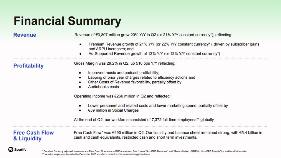 Revenue  Profitability  Free Cash Flow & Liquidity  Gross Margin was 29.2% in Q2, up 510 bps Y/Y reflecting:  Improved music and podcast profitability,  Lapping of prior year charges related to efficiency actions and  Other Costs of Revenue favorability, partially offset by  Audiobooks costs  Operating Income was €266 million in Q2 and reflected:  Lower personnel and related costs and lower marketing spend, partially offset by  €59 million in Social Charges  At the end of Q2, our workforce consisted of 7,372 full-time employees** globally  Revenue of €3,807 million grew 20% Y/Y in Q2 (or 21% Y/Y constant currency*), reflecting:  Premium Revenue growth of 21% Y/Y (or 22% Y/Y constant currency*), driven by subscriber gains and ARPU increases; and  Ad-Supported Revenue growth of 13% Y/Y (or 12% Y/Y constant currency*)  Free Cash Flow* was €490 million in Q2. Our liquidity and balance sheet remained strong, with €5.4 billion in cash and cash equivalents, restricted cash and short term investments.  Financial Summary  * Constant Currency adjusted measures and Free Cash Flow are non-IFRS measures. See "Use of Non-IFRS Measures" and "Reconciliation of IFRS to Non-IFRS Results" for additional information.  ** Includes employees impacted by December 2023 workforce reduction that remained on garden leave.