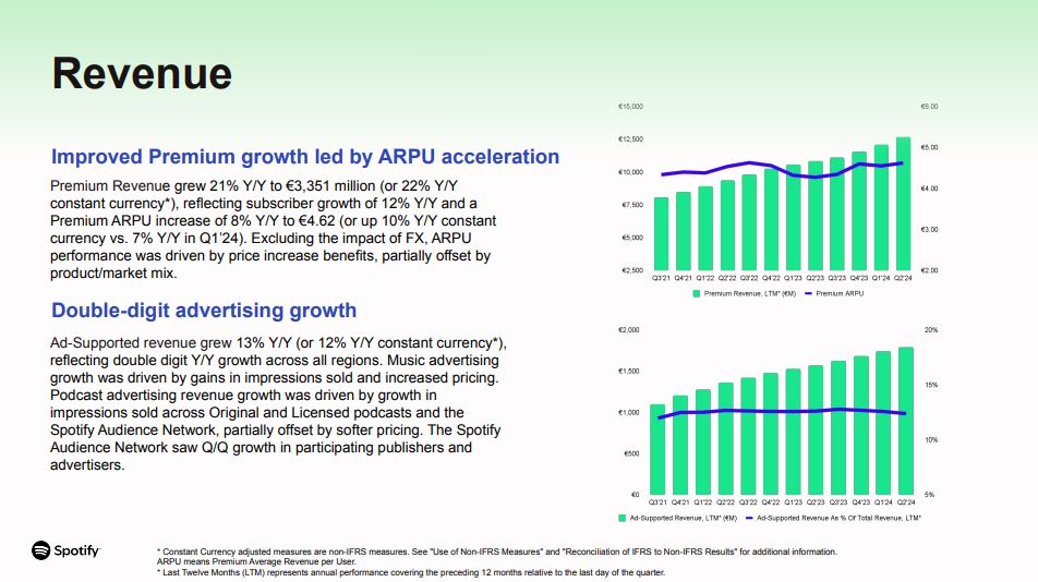 Revenue  Constant Currency adjusted measures are non-IFRS measures. See "Use of Non-IFRS Measures" and "Reconciliation of IFRS to Non-IFRS Results" for additional information. ARPU means Premium Average Revenue per User.  Last Twelve Months (LTM) represents annual performance covering the preceding 12 months relative to the last day of the quarter.  Improved Premium growth led by ARPU acceleration  Premium Revenue grew 21% Y/Y to €3,351 million (or 22% Y/Y constant currency*), reflecting subscriber growth of 12% Y/Y and a Premium ARPU increase of 8% Y/Y to €4.62 (or up 10% Y/Y constant currency vs. 7% Y/Y in Q1’24). Excluding the impact of FX, ARPU performance was driven by price increase benefits, partially offset by product/market mix.  Double-digit advertising growth  Ad-Supported revenue grew 13% Y/Y (or 12% Y/Y constant currency*), reflecting double digit Y/Y growth across all regions. Music advertising growth was driven by gains in impressions sold and increased pricing. Podcast advertising revenue growth was driven by growth in impressions sold across Original and Licensed podcasts and the Spotify Audience Network, partially offset by softer pricing. The Spotify Audience Network saw Q/Q growth in participating publishers and advertisers.