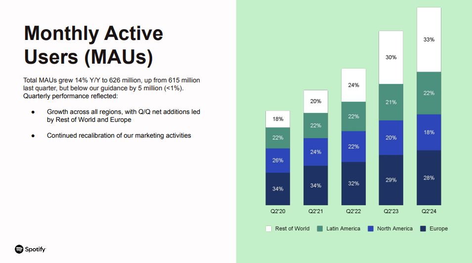 Total MAUs grew 14% Y/Y to 626 million, up from 615 million last quarter, but below our guidance by 5 million (<1%).  Quarterly performance reflected:  Growth across all regions, with Q/Q net additions led by Rest of World and Europe  Continued recalibration of our marketing activities  Monthly Active Users (MAUs)