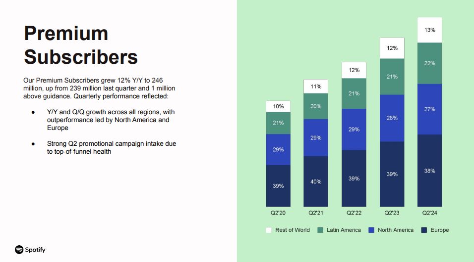 Our Premium Subscribers grew 12% Y/Y to 246 million, up from 239 million last quarter and 1 million above guidance. Quarterly performance reflected:  Y/Y and Q/Q growth across all regions, with outperformance led by North America and Europe  Strong Q2 promotional campaign intake due to top-of-funnel health  Premium Subscribers