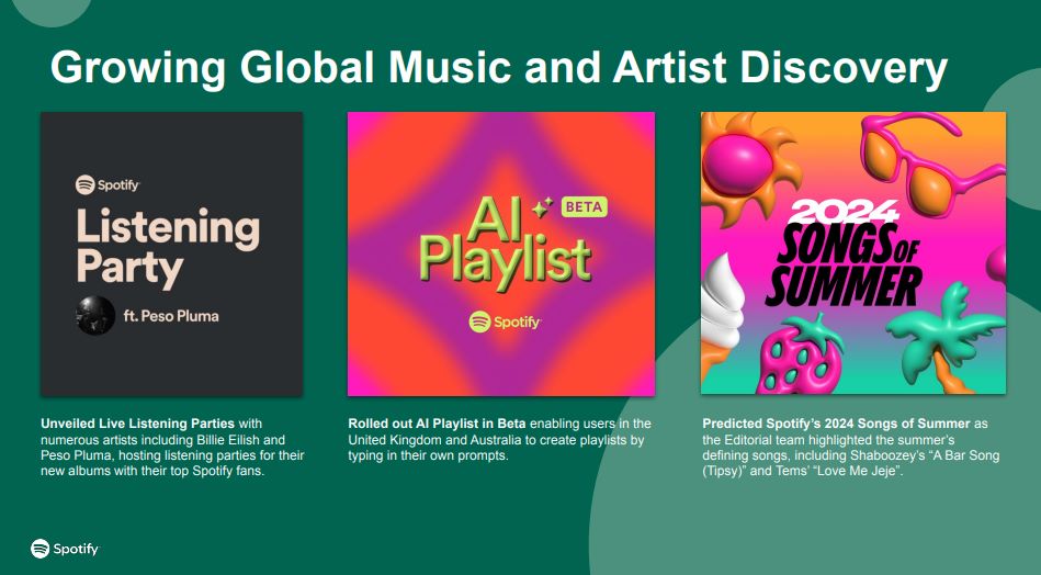 Growing Global Music and Artist Discovery  Predicted Spotify’s 2024 Songs of Summer as the Editorial team highlighted the summer’s defining songs, including Shaboozey’s “A Bar Song (Tipsy)” and Tems’ “Love Me Jeje”.  Rolled out AI Playlist in Beta enabling users in the United Kingdom and Australia to create playlists by typing in their own prompts.  Unveiled Live Listening Parties with numerous artists including Billie Eilish and Peso Pluma, hosting listening parties for their new albums with their top Spotify fans.
