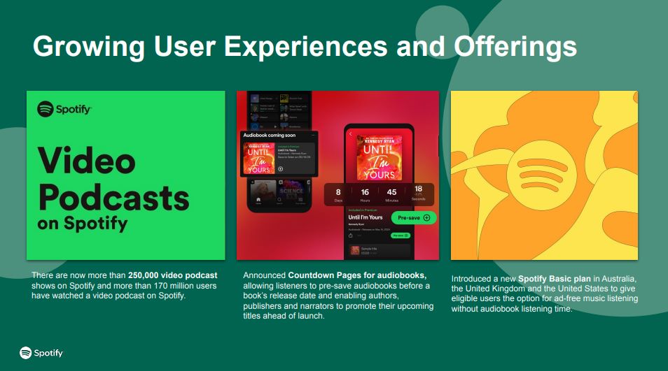 Growing User Experiences and Offerings  There are now more than 250,000 video podcast shows on Spotify and more than 170 million users have watched a video podcast on Spotify.  Introduced a new Spotify Basic plan in Australia, the United Kingdom and the United States to give eligible users the option for ad-free music listening without audiobook listening time.  Announced Countdown Pages for audiobooks, allowing listeners to pre-save audiobooks before a book’s release date and enabling authors, publishers and narrators to promote their upcoming titles ahead of launch.