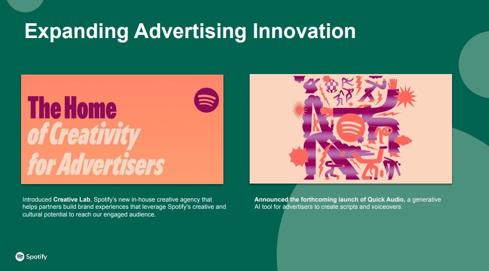 Expanding Advertising Innovation  Introduced Creative Lab, Spotify’s new in-house creative agency that helps partners build brand experiences that leverage Spotify's creative and cultural potential to reach our engaged audience.  Announced the forthcoming launch of Quick Audio, a generative AI tool for advertisers to create scripts and voiceovers.