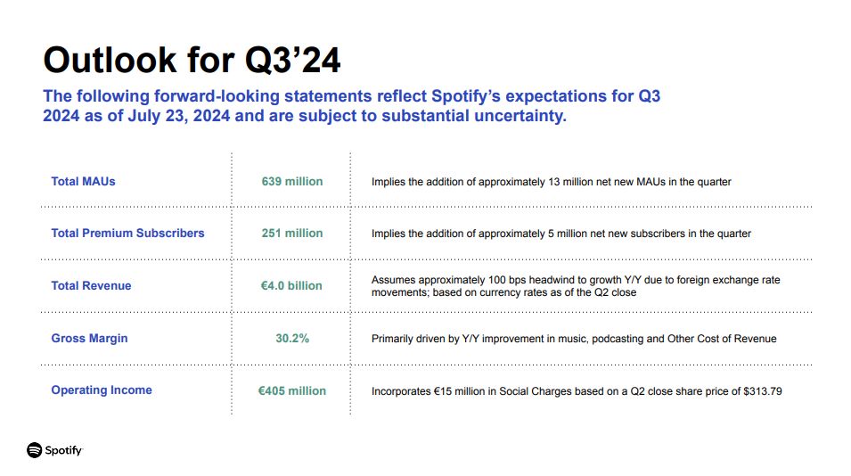 Outlook for Q3’24  The following forward-looking statements reflect Spotify’s expectations for Q3 2024 as of July 23, 2024 and are subject to substantial uncertainty.  Total MAUs  639 million  Implies the addition of approximately 13 million net new MAUs in the quarter  Total Premium Subscribers  251 million  Implies the addition of approximately 5 million net new subscribers in the quarter  Total Revenue  €4.0 billion  Assumes approximately 100 bps headwind to growth Y/Y due to foreign exchange rate movements; based on currency rates as of the Q2 close  Gross Margin  30.2%  Primarily driven by Y/Y improvement in music, podcasting and Other Cost of Revenue  Operating Income  €405 million  Incorporates €15 million in Social Charges based on a Q2 close share price of $313.79