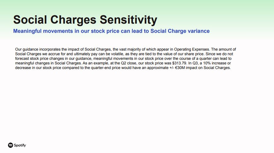 Social Charges Sensitivity  Meaningful movements in our stock price can lead to Social Charge variance  Our guidance incorporates the impact of Social Charges, the vast majority of which appear in Operating Expenses. The amount of Social Charges we accrue for and ultimately pay can be volatile, as they are tied to the value of our share price. Since we do not forecast stock price changes in our guidance, meaningful movements in our stock price over the course of a quarter can lead to meaningful changes in Social Charges. As an example, at the Q2 close, our stock price was $313.79. In Q3, a 10% increase or decrease in our stock price compared to the quarter-end price would have an approximate +/- €30M impact on Social Charges.