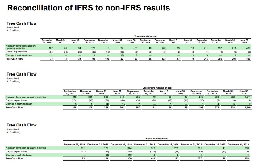 Free Cash Flow  (Unaudited) (in € millions)  Three months ended  December  March 31,  June 30, September  December  March 31,  June 30, September December  March 31,  June 30, September  December  March 31,  June 30,  31, 2020  2021  2021 30, 2021  31, 2021  2022  2022 30, 2022 31, 2022  2023  2023 30, 2023  31, 2023  2024  2024  Net cash flows from/(used in) operating activities  107  65  54  123  119  37  39  40  (70)  59  13  211  397  211  492  Capital expenditures  (35)  (24)  (20)  (25)  (16)  (10)  (5)  (5)  (5)  (2)  (2)  (1)  (1)  (5)  (2)  Change in restricted cash  2  —  —  1  —  (5)  3  —  2  —  (2)  6  —  1  —  Free Cash Flow  74  41  34  99  103  22  37  35  (73)  57  9  216  396  207  490  Free Cash Flow  (Unaudited)  (in € millions)  Last twelve months ended  September  December  March 31,  June 30,  September  December March 31,  June 30,  September  December  March 31,  June 30,  30, 2021  31, 2021  2022  2022  30, 2022  31, 2022 2023  2023  30, 2023  31, 2023  2024  2024  Net cash flows from operating activities  349  361  333  318  235  46 68  42  213  680  832  1,311  Capital expenditures  (104)  (85)  (71)  (56)  (36)  (25) (17)  (14)  (10)  (6)  (9)  (9)  Change in restricted cash  3  1  (4)  (1)  (2)  — 5  —  6  4  5  7  Free Cash Flow  248  277  258  261  197  21 56  28  209  678  828  1,309  Reconciliation of IFRS to non-IFRS results  Twelve months ended  December 31, 2016 December 31, 2017 December 31, 2018 December 31, 2019 December 31, 2020 December 31, 2021 December 31, 2022 December 31, 2023  Net cash flows from operating activities  101  179  344  573  259  361  46  680  Capital expenditures  (27)  (36)  (125)  (135)  (78)  (85)  (25)  (6)  Change in restricted cash  (1)  (34)  (10)  2  2  1  —  4  Free Cash Flow  73  109  209  440  183  277  21  678  Free Cash Flow  (Unaudited) (in € millions)