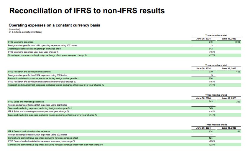 Operating expenses on a constant currency basis  (Unaudited)  (in € millions, except percentages)  Three months ended  June 30, 2024 June 30, 2023  IFRS Research and development expenses 379 453  Foreign exchange effect on 2024 expenses using 2023 rates 3  Research and development expenses excluding foreign exchange effect 376  IFRS Research and development expenses year over year change % (16)%  Research and development expenses excluding foreign exchange effect year-over-year change % (17)%  Reconciliation of IFRS to non-IFRS results  Three months ended  June 30, 2024 June 30, 2023  IFRS Sales and marketing expenses 343 399  Foreign exchange effect on 2024 expenses using 2023 rates —  Sales and marketing expenses excluding foreign exchange effect 343  IFRS Sales and marketing expenses year over year change % (14)%  Sales and marketing expenses excluding foreign exchange effect year-over-year change % (14)%  Three months ended  June 30, 2024 June 30, 2023  IFRS General and administrative expenses 124 161  Foreign exchange effect on 2024 expenses using 2023 rates —  General and administrative expenses excluding foreign exchange effect 124  IFRS General and administrative expenses year over year change % (23)%  General and administrative expenses excluding foreign exchange effect year-over-year change % (23)%  Three months ended  June 30, 2024  June 30, 2023  IFRS Operating expenses  846  1,013  Foreign exchange effect on 2024 operating expenses using 2023 rates  3  Operating expenses excluding foreign exchange effect  843  IFRS Operating expenses year over year change %  (16)%  Operating expenses excluding foreign exchange effect year-over-year change %  (17)%