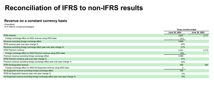 Three months ended  June 30, 2024  June 30, 2023  IFRS revenue  3,807  3,177  Foreign exchange effect on 2024 revenue using 2023 rates  (41)  Revenue excluding foreign exchange effect  3,848  IFRS revenue year-over-year change %  20%  Revenue excluding foreign exchange effect year-over-year change %  21%  IFRS Premium revenue  3,351  2,773  Foreign exchange effect on 2024 Premium revenue using 2023 rates  (45)  Premium revenue excluding foreign exchange effect  3,396  IFRS Premium revenue year-over-year change %  21%  Premium revenue excluding foreign exchange effect year-over-year change %  22%  IFRS Ad-Supported revenue  456  404  Foreign exchange effect on 2024 Ad-Supported revenue using 2023 rates  4  Ad-Supported revenue excluding foreign exchange effect  452  IFRS Ad-Supported revenue year-over-year change %  13%  Ad-Supported revenue excluding foreign exchange effect year-over-year change %  12%  Revenue on a constant currency basis  (Unaudited)  (in € millions, except percentages)  Reconciliation of IFRS to non-IFRS results