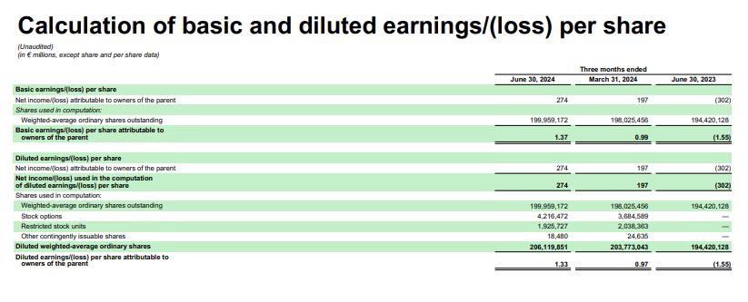 June 30, 2024  March 31, 2024  June 30, 2023  Basic earnings/(loss) per share  Net income/(loss) attributable to owners of the parent  274  197  (302)  Shares used in computation:  Weighted-average ordinary shares outstanding  199,959,172  198,025,456  194,420,128  Basic earnings/(loss) per share attributable to owners of the parent   1.37   0.99   (1.55)  Diluted earnings/(loss) per share  Net income/(loss) attributable to owners of the parent  274  197  (302)  Net income/(loss) used in the computation of diluted earnings/(loss) per share  274  197  (302)  Shares used in computation:  Weighted-average ordinary shares outstanding  199,959,172  198,025,456  194,420,128  Stock options  4,216,472  3,684,589  —  Restricted stock units  1,925,727  2,038,363  —  Other contingently issuable shares  18,480  24,635  —  Diluted weighted-average ordinary shares  206,119,851  203,773,043  194,420,128  Diluted earnings/(loss) per share attributable to owners of the parent   1.33   0.97  (1.55)  (Unaudited)  (in € millions, except share and per share data)  Three months ended  Calculation of basic and diluted earnings/(loss) per share