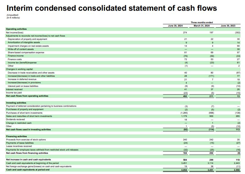 June 30, 2024  March 31, 2024  June 30, 2023  Operating activities  Net income/(loss)  274  197  (302)  Adjustments to reconcile net income/(loss) to net cash flows  Depreciation of property and equipment  21  22  30  Amortization of intangible assets  9  9  14  Impairment charges on real estate assets  14  4  90  Write-off of content assets  —  —  30  Share-based compensation expense  81  69  97  Finance income  (76)  (59)  (33)  Finance costs  72  53  27  Income tax (benefit)/expense  (4)  (23)  61  Other  (1)  —  2  Changes in working capital:  Decrease in trade receivables and other assets  40  80  (97)  Increase/(decrease) in trade and other liabilities  28  (171)  77  Increase in deferred revenue  21  7  18  Increase/(decrease) in provisions  4  —  (2)  Interest paid on lease liabilities  (9)  (9)  (10)  Interest received  41  37  26  Income tax paid  (23)  (5)  (15)  Net cash flows from operating activities  492  211  13  Investing activities  Payment of deferred consideration pertaining to business combinations  (3)  (7)  —  Purchases of property and equipment  (2)  (5)  (2)  Purchases of short term investments  (1,285)  (998)  (138)  Sales and maturities of short term investments  1,179  900  265  Dividends recieved  18  —  —  Change in restricted cash  —  1  (2)  Other  1  (5)  (10)  Net cash flows used in investing activities  (92)  (114)  113  Financing activities  Proceeds from exercise of stock options  240  242  35  Payments of lease liabilities  (24)  (15)  (27)  Lease incentives received  —  —  —  Payments for employee taxes withheld from restricted stock unit releases  (32)  (25)  (16)  Net cash flows from financing activities  184  202  (8)  Net increase in cash and cash equivalents  584  299  118  Cash and cash equivalents at beginning of the period  3,451  3,114  2,443  Net foreign exchange gains/(losses) on cash and cash equivalents  19  38  (11)  Cash and cash equivalents at period end   4,054   3,451  2,550  (Unaudited) (in € millions)  Three months ended  Interim condensed consolidated statement of cash flows