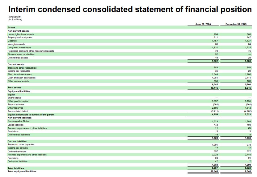 June 30, 2024  December 31, 2023  Assets  Non-current assets  Lease right-of-use assets  254  300  Property and equipment  211  247  Goodwill  1,167  1,137  Intangible assets  68  84  Long term investments  1,931  1,215  Restricted cash and other non-current assets  70  75  Finance lease receivables  52  —  Deferred tax assets  49  28  3,802  3,086  Current assets  Trade and other receivables  753  858  Income tax receivable  35  20  Short term investments  1,344  1,100  Cash and cash equivalents  4,054  3,114  Other current assets  158  168  6,344  5,260  Total assets   10,146  8,346  Equity and liabilities  Equity  Share capital  —  —  Other paid in capital  5,637  5,155  Treasury shares  (262)  (262)  Other reserves  2,595  1,812  Accumulated deficit  (3,711)  (4,182)  Equity attributable to owners of the parent  4,259  2,523  Non-current liabilities  Exchangeable Notes  1,323  1,203  Lease liabilities  472  493  Accrued expenses and other liabilities  11  26  Provisions  3  3  Deferred tax liabilities  19  8   1,828  1,733  Current liabilities  Trade and other payables  1,091  978  Income tax payable  17  12  Deferred revenue  657  622  Accrued expenses and other liabilities  2,223  2,440  Provisions  24  21  Derivative liabilities  47  17  4,059  4,090  Total liabilities  5,887  5,823  Total equity and liabilities   10,146  8,346  Interim condensed consolidated statement of financial position  (Unaudited) (in € millions)