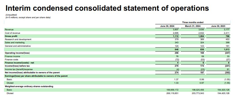 Interim condensed consolidated statement of operations  (Unaudited)  (in € millions, except share and per share data)  Three months ended  June 30, 2024  March 31, 2024  June 30, 2023  Revenue  3,807  3,636  3,177  Cost of revenue  2,695  2,632  2,411  Gross profit  1,112  1,004  766  Research and development  379  389  453  Sales and marketing  343  324  399  General and administrative  124  123  161  846  836  1,013  Operating income/(loss)  266  168  (247)  Finance income  76  59  33  Finance costs  (72)  (53)  (27)  Finance income/(costs) - net  4  6  6  Income/(loss) before tax  270  174  (241)  Income tax (benefit)/expense  (4)  (23)  61  Net income/(loss) attributable to owners of the parent  274  197  (302)  Earnings/(loss) per share attributable to owners of the parent  Basic  1.37  0.99  (1.55)  Diluted 1.33  0.97  (1.55)  Basic 199,959,172  198,025,456  194,420,128  Weighted-average ordinary shares outstanding  Diluted  206,119,851  203,773,043  194,420,128