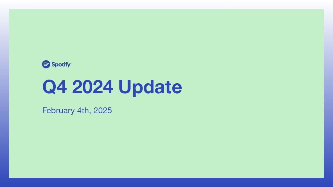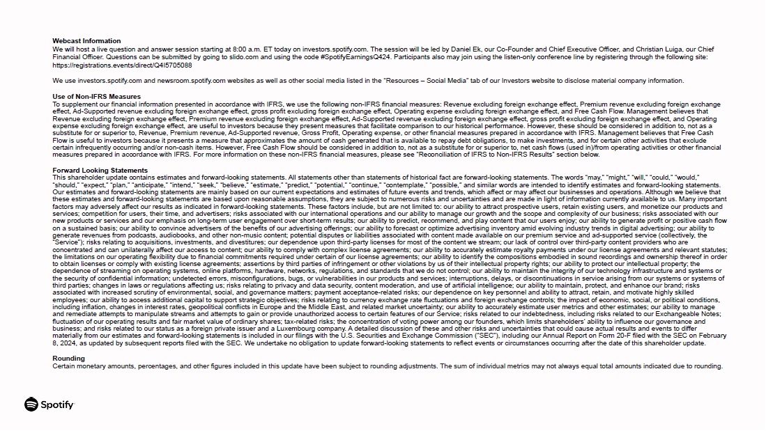 Webcast Information  We will host a live question and answer session starting at 8:00 a.m. ET today on investors.spotify.com. The session will be led by Daniel Ek, our Co-Founder and Chief Executive Officer, and Christian Luiga, our Chief Financial Officer. Questions can be submitted by going to slido.com and using the code #SpotifyEarningsQ424. Participants also may join using the listen-only conference line by registering through the following site: https://registrations.events/direct/Q4I5705088  We use investors.spotify.com and newsroom.spotify.com websites as well as other social media listed in the “Resources – Social Media” tab of our Investors website to disclose material company information.  Use of Non-IFRS Measures  To supplement our financial information presented in accordance with IFRS, we use the following non-IFRS financial measures: Revenue excluding foreign exchange effect, Premium revenue excluding foreign exchange effect, Ad-Supported revenue excluding foreign exchange effect, gross profit excluding foreign exchange effect, Operating expense excluding foreign exchange effect, and Free Cash Flow. Management believes that Revenue excluding foreign exchange effect, Premium revenue excluding foreign exchange effect, Ad-Supported revenue excluding foreign exchange effect, gross profit excluding foreign exchange effect, and Operating expense excluding foreign exchange effect, are useful to investors because they present measures that facilitate comparison to our historical performance. However, these should be considered in addition to, not as a substitute for or superior to, Revenue, Premium revenue, Ad-Supported revenue, Gross Profit, Operating expense, or other financial measures prepared in accordance with IFRS. Management believes that Free Cash Flow is useful to investors because it presents a measure that approximates the amount of cash generated that is available to repay debt obligations, to make investments, and for certain other activities that exclude certain infrequently occurring and/or non-cash items. However, Free Cash Flow should be considered in addition to, not as a substitute for or superior to, net cash flows (used in)/from operating activities or other financial measures prepared in accordance with IFRS. For more information on these non-IFRS financial measures, please see “Reconciliation of IFRS to Non-IFRS Results” section below.  Forward Looking Statements  This shareholder update contains estimates and forward-looking statements. All statements other than statements of historical fact are forward-looking statements. The words “may,” “might,” “will,” “could,” “would,” “should,” “expect,” “plan,” “anticipate,” “intend,” “seek,” “believe,” “estimate,” “predict,” “potential,” “continue,” “contemplate,” “possible,” and similar words are intended to identify estimates and forward-looking statements. Our estimates and forward-looking statements are mainly based on our current expectations and estimates of future events and trends, which affect or may affect our businesses and operations. Although we believe that these estimates and forward-looking statements are based upon reasonable assumptions, they are subject to numerous risks and uncertainties and are made in light of information currently available to us. Many important factors may adversely affect our results as indicated in forward-looking statements. These factors include, but are not limited to: our ability to attract prospective users, retain existing users, and monetize our products and services; competition for users, their time, and advertisers; risks associated with our international operations and our ability to manage our growth and the scope and complexity of our business; risks associated with our new products or services and our emphasis on long-term user engagement over short-term results; our ability to predict, recommend, and play content that our users enjoy; our ability to generate profit or positive cash flow on a sustained basis; our ability to convince advertisers of the benefits of our advertising offerings; our ability to forecast or optimize advertising inventory amid evolving industry trends in digital advertising; our ability to generate revenues from podcasts, audiobooks, and other non-music content; potential disputes or liabilities associated with content made available on our premium service and ad-supported service (collectively, the “Service”); risks relating to acquisitions, investments, and divestitures; our dependence upon third-party licenses for most of the content we stream; our lack of control over third-party content providers who are concentrated and can unilaterally affect our access to content; our ability to comply with complex license agreements; our ability to accurately estimate royalty payments under our license agreements and relevant statutes; the limitations on our operating flexibility due to financial commitments required under certain of our license agreements; our ability to identify the compositions embodied in sound recordings and ownership thereof in order to obtain licenses or comply with existing license agreements; assertions by third parties of infringement or other violations by us of their intellectual property rights; our ability to protect our intellectual property; the dependence of streaming on operating systems, online platforms, hardware, networks, regulations, and standards that we do not control; our ability to maintain the integrity of our technology infrastructure and systems or the security of confidential information; undetected errors, misconfigurations, bugs, or vulnerabilities in our products and services; interruptions, delays, or discontinuations in service arising from our systems or systems of third parties; changes in laws or regulations affecting us; risks relating to privacy and data security, content moderation, and u