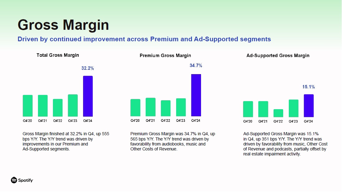 Premium Gross Margin was 34.7% in Q4, up 565 bps Y/Y. The Y/Y trend was driven by favorability from audiobooks, music and Other Costs of Revenue.  Gross Margin  Driven by continued improvement across Premium and Ad-Supported segments  Gross Margin finished at 32.2% in Q4, up 555 bps Y/Y. The Y/Y trend was driven by improvements in our Premium and  Ad-Supported segments.  Ad-Supported Gross Margin was 15.1% in Q4, up 351 bps Y/Y. The Y/Y trend was  driven by favorability from music, Other Cost of Revenue and podcasts, partially offset by real estate impairment activity.