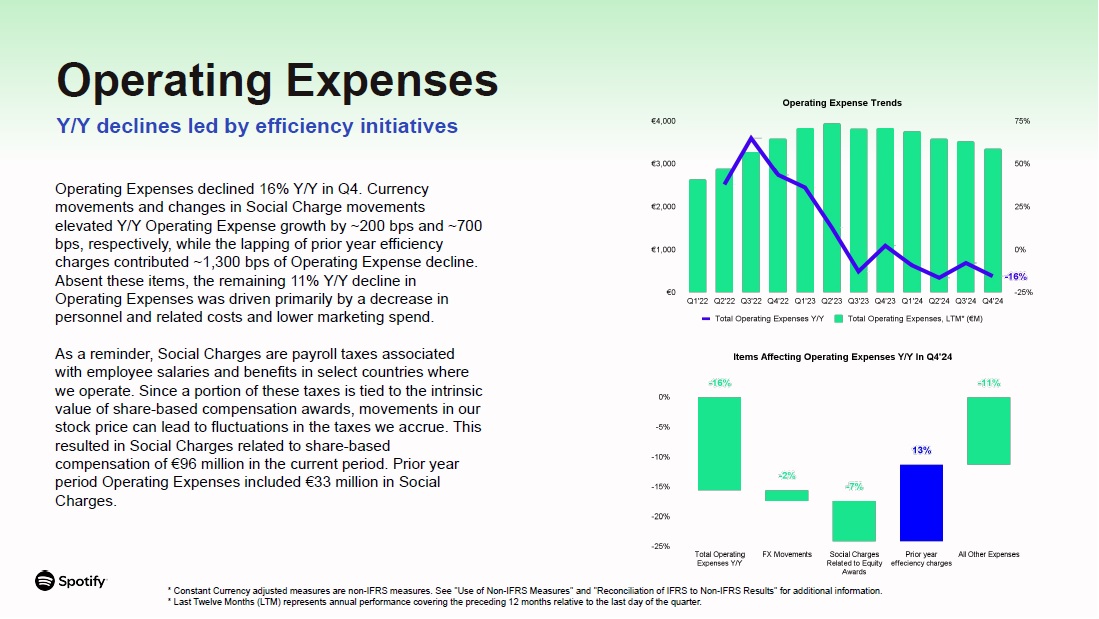 Operating Expenses declined 16% Y/Y in Q4. Currency movements and changes in Social Charge movements elevated Y/Y Operating Expense growth by ~200 bps and ~700 bps, respectively, while the lapping of prior year efficiency charges contributed ~1,300 bps of Operating Expense decline. Absent these items, the remaining 11% Y/Y decline in Operating Expenses was driven primarily by a decrease in personnel and related costs and lower marketing spend.  As a reminder, Social Charges are payroll taxes associated with employee salaries and benefits in select countries where we operate. Since a portion of these taxes is tied to the intrinsic value of share-based compensation awards, movements in our stock price can lead to fluctuations in the taxes we accrue. This resulted in Social Charges related to share-based compensation of €96 million in the current period. Prior year period Operating Expenses included €33 million in Social Charges.  Operating Expenses  Y/Y declines led by efficiency initiatives  Constant Currency adjusted measures are non-IFRS measures. See "Use of Non-IFRS Measures" and "Reconciliation of IFRS to Non-IFRS Results" for additional information.  Last Twelve Months (LTM) represents annual performance covering the preceding 12 months relative to the last day of the quarter.