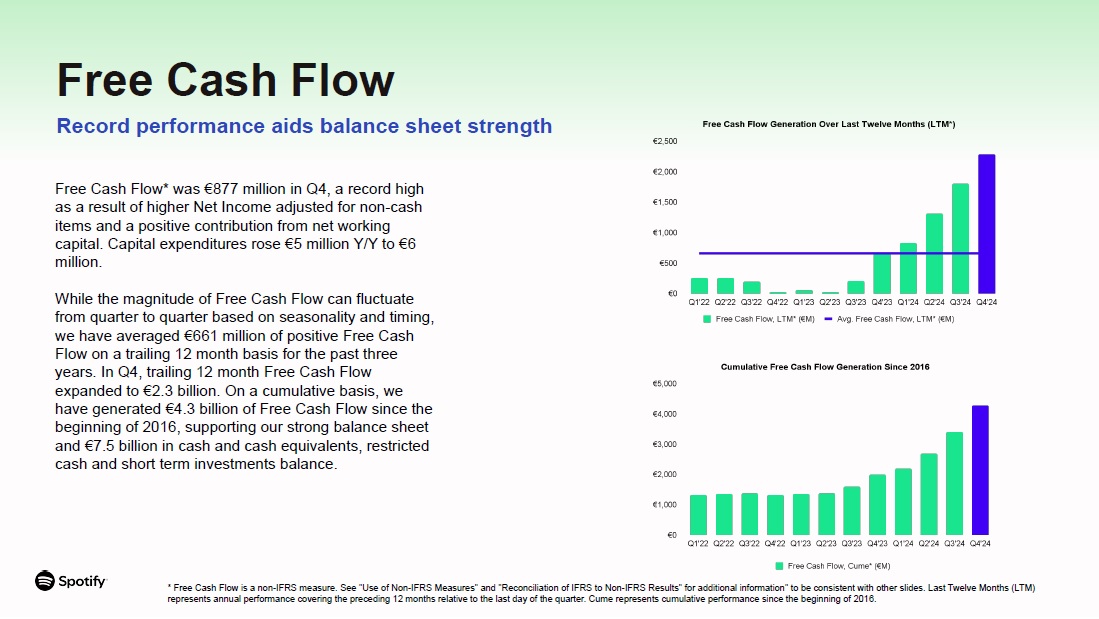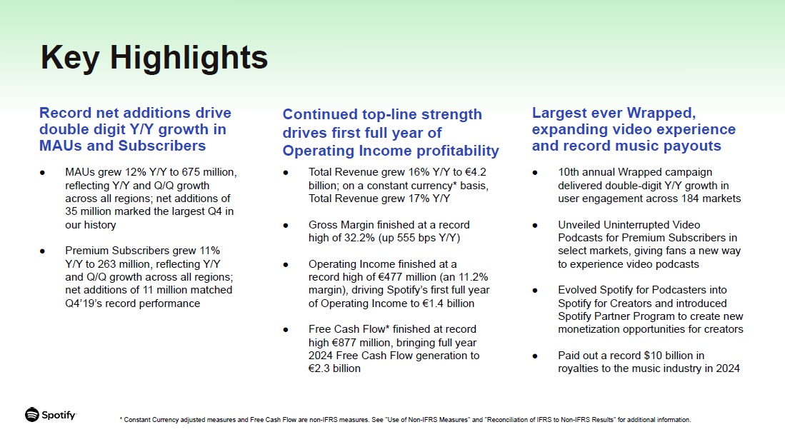 * Constant Currency adjusted measures and Free Cash Flow are non-IFRS measures. See "Use of Non-IFRS Measures" and "Reconciliation of IFRS to Non-IFRS Results" for additional information.  Record net additions drive  double digit Y/Y growth in MAUs and Subscribers  10th annual Wrapped campaign delivered double-digit Y/Y growth in user engagement across 184 markets  Unveiled Uninterrupted Video Podcasts for Premium Subscribers in select markets, giving fans a new way to experience video podcasts  Evolved Spotify for Podcasters into Spotify for Creators and introduced Spotify Partner Program to create new monetization opportunities for creators  Paid out a record $10 billion in royalties to the music industry in 2024  Key Highlights  Continued top-line strength  drives first full year of Operating Income profitability  Total Revenue grew 16% Y/Y to €4.2 billion; on a constant currency* basis, Total Revenue grew 17% Y/Y  Gross Margin finished at a record high of 32.2% (up 555 bps Y/Y)  Operating Income finished at a record high of €477 million (an 11.2% margin), driving Spotify’s first full year of Operating Income to €1.4 billion  Free Cash Flow* finished at record high €877 million, bringing full year 2024 Free Cash Flow generation to  €2.3 billion  Largest ever Wrapped,  expanding video experience and record music payouts  MAUs grew 12% Y/Y to 675 million, reflecting Y/Y and Q/Q growth across all regions; net additions of 35 million marked the largest Q4 in our history  Premium Subscribers grew 11% Y/Y to 263 million, reflecting Y/Y and Q/Q growth across all regions; net additions of 11 million matched Q4’19’s record performance