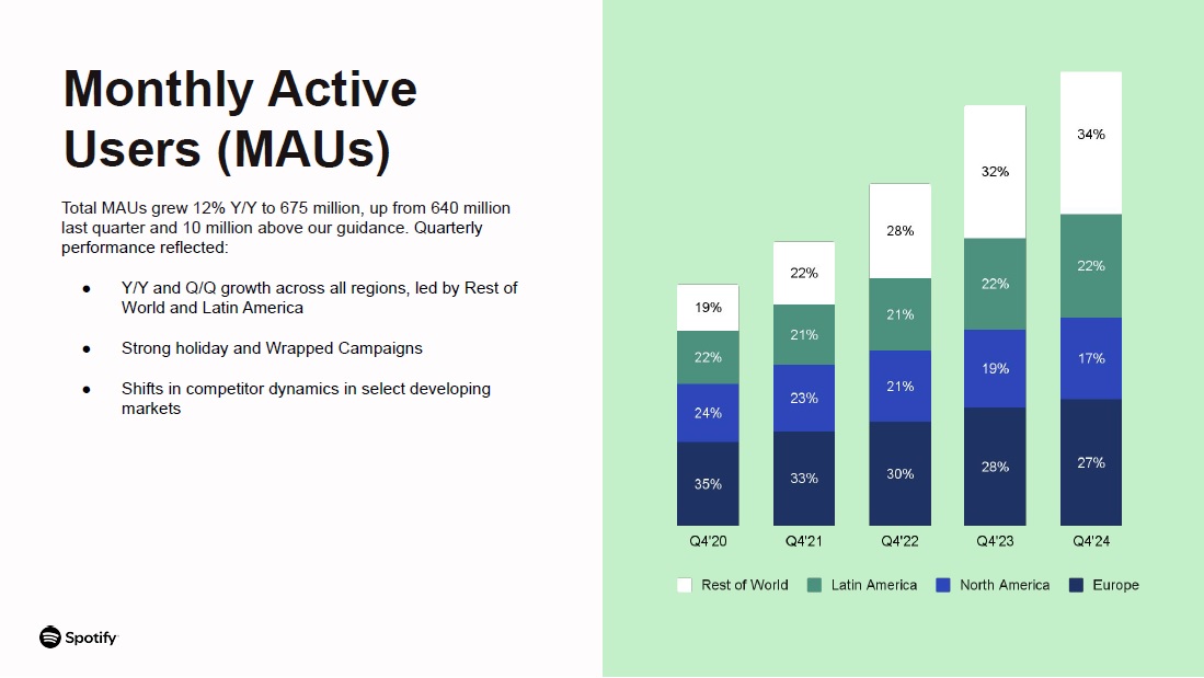 Total MAUs grew 12% Y/Y to 675 million, up from 640 million last quarter and 10 million above our guidance. Quarterly performance reflected:  Y/Y and Q/Q growth across all regions, led by Rest of World and Latin America  Strong holiday and Wrapped Campaigns  Shifts in competitor dynamics in select developing markets  Monthly Active Users (MAUs)